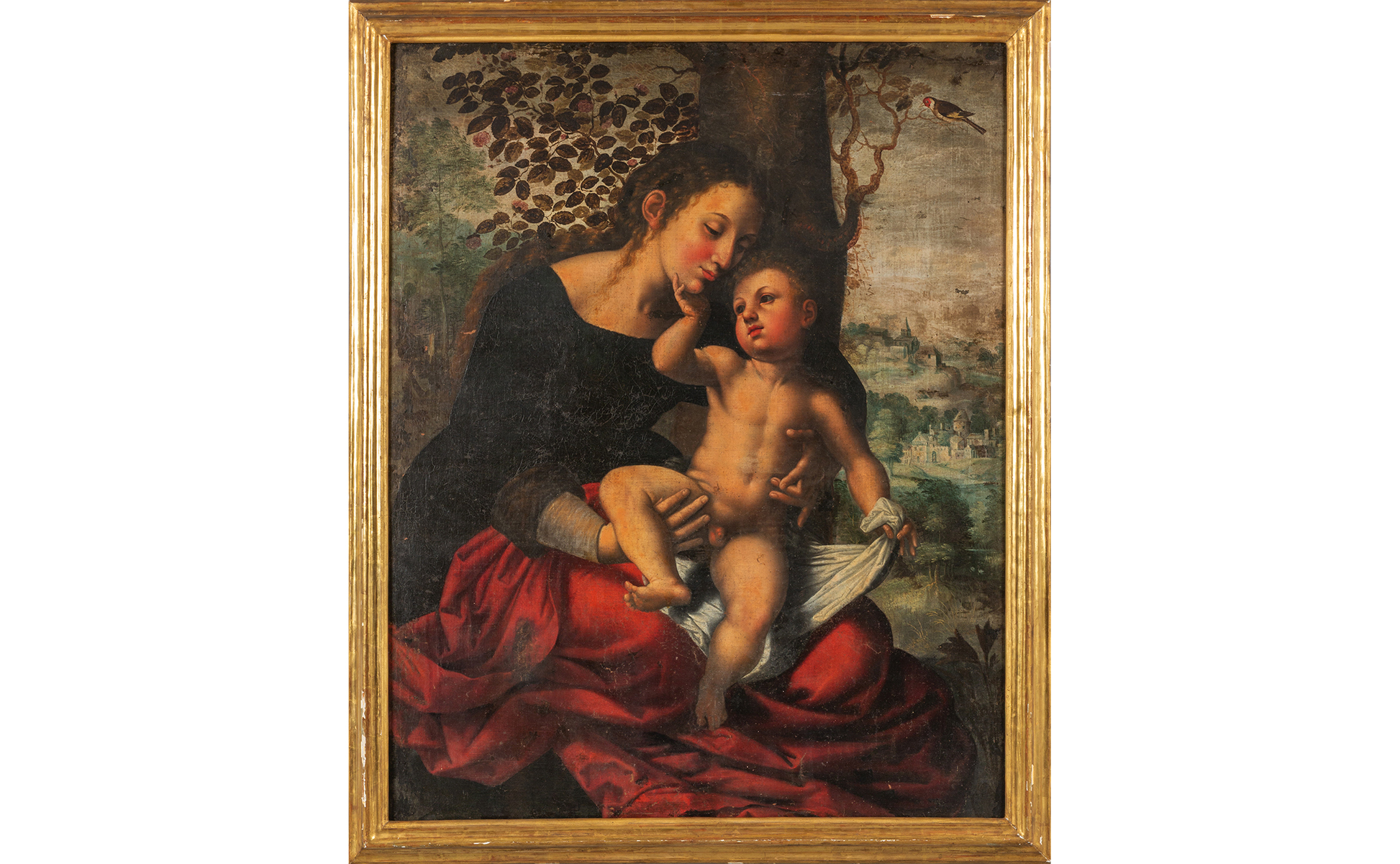 Scuola fiamminga sec.XVII 'Madonna con Bambino con nello sfondo un paesaggio' olio