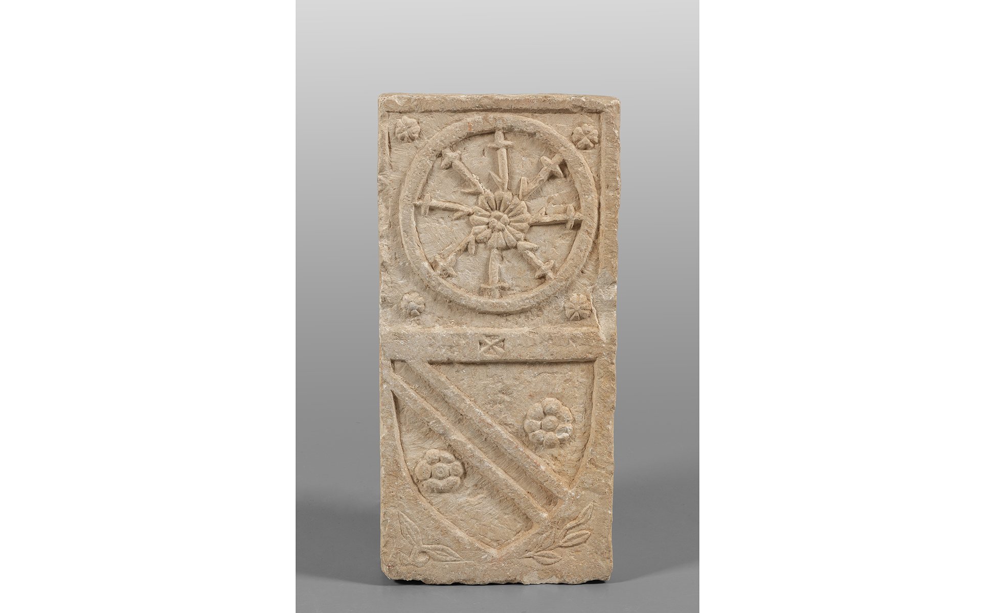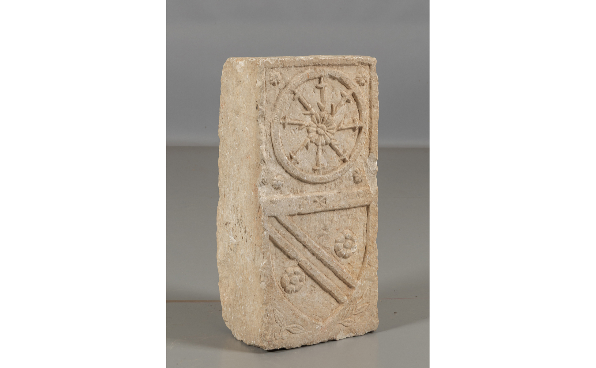 Lesena in pietra di epoca medioevale scolpita con stemma nobiliare sormontato da una ruota Centro Italia sec.XIV