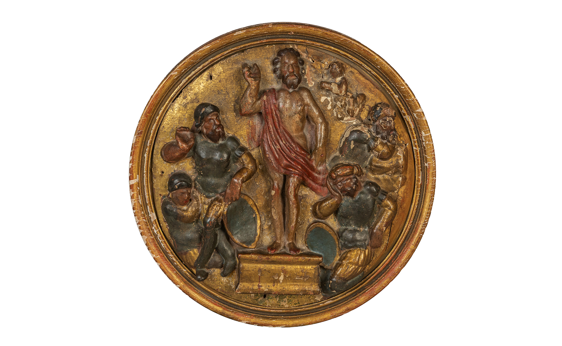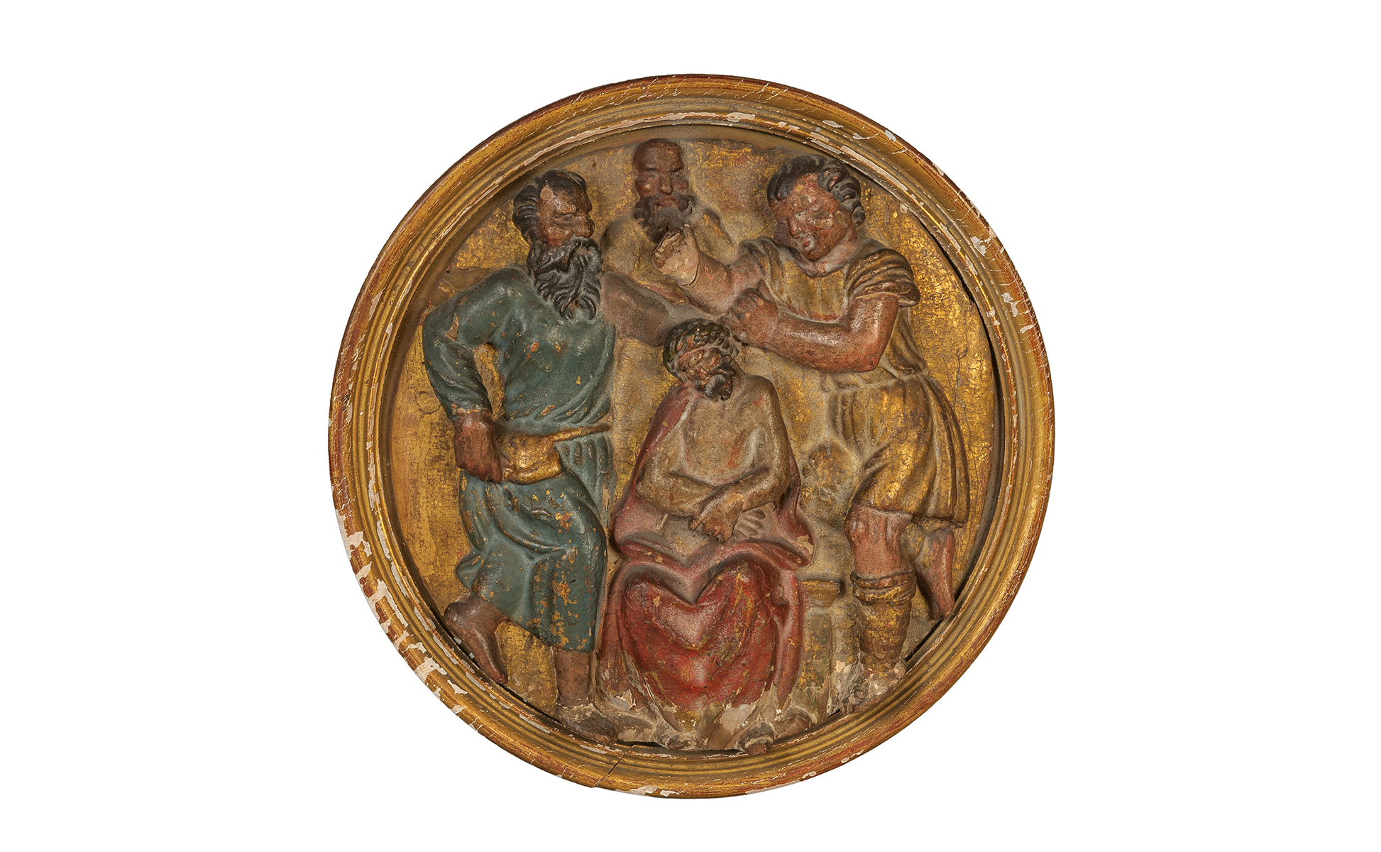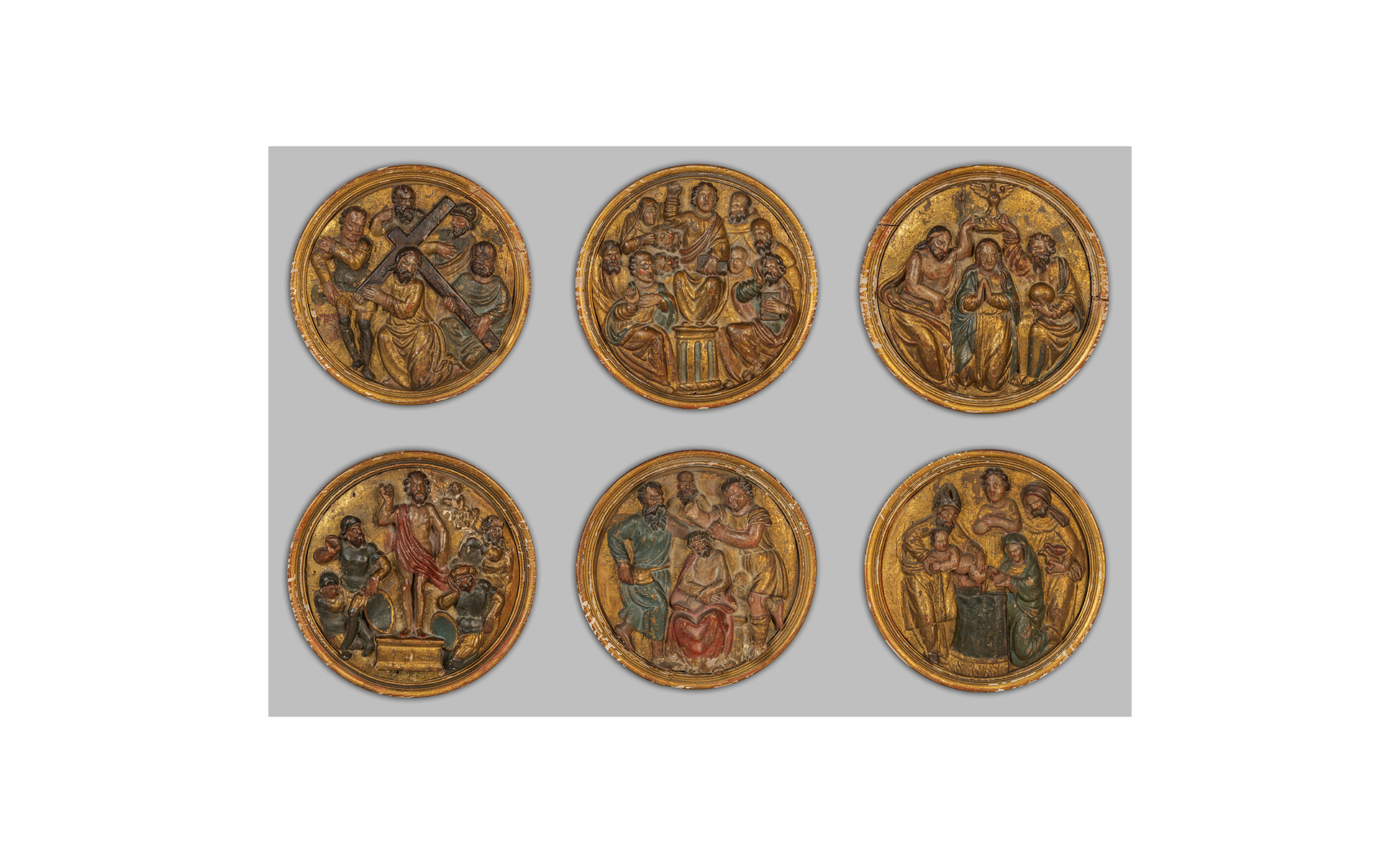 Sei sculture ad altorilievo di forma rotonda in legno dorato e policromato raffiguranti soggetti biblici Piemonte sec.XVII cornicette in legno dorato di epoca successiva