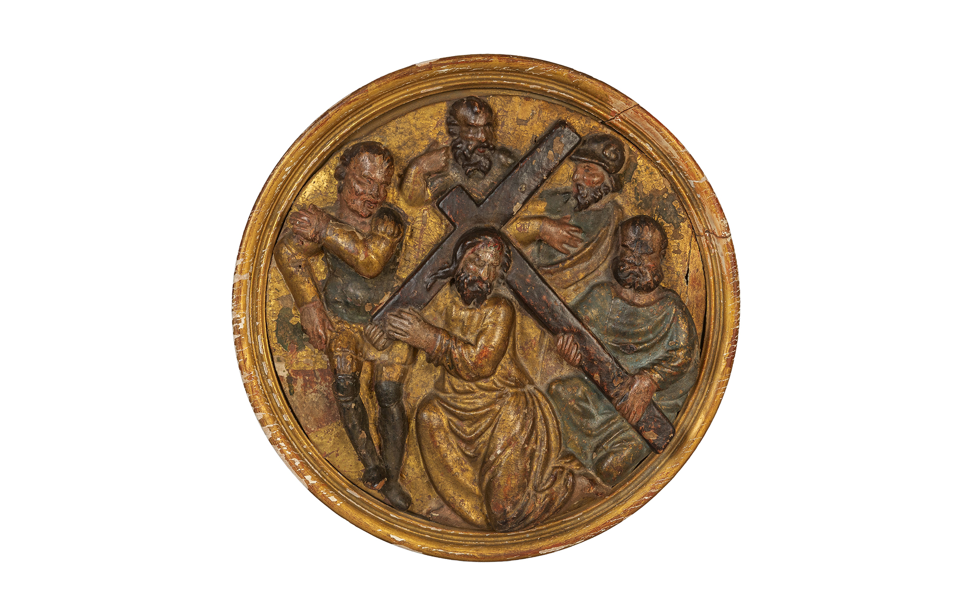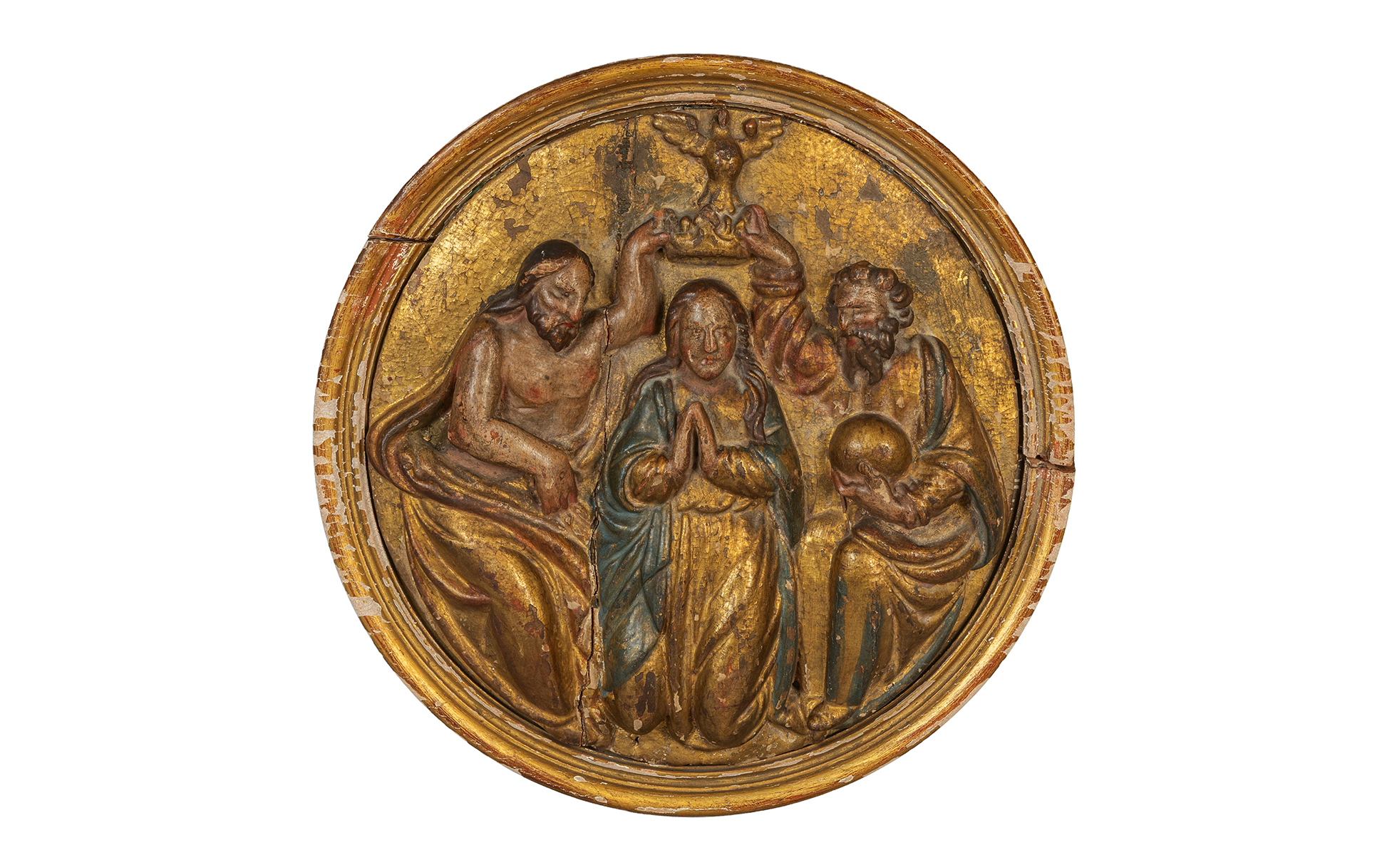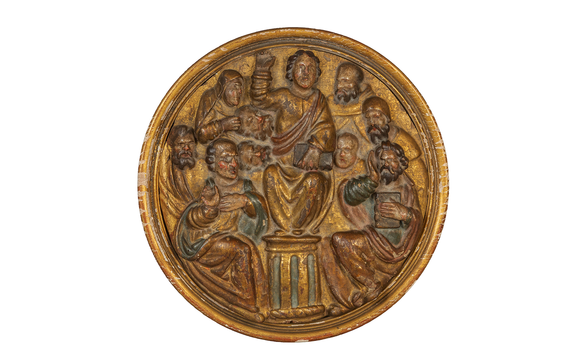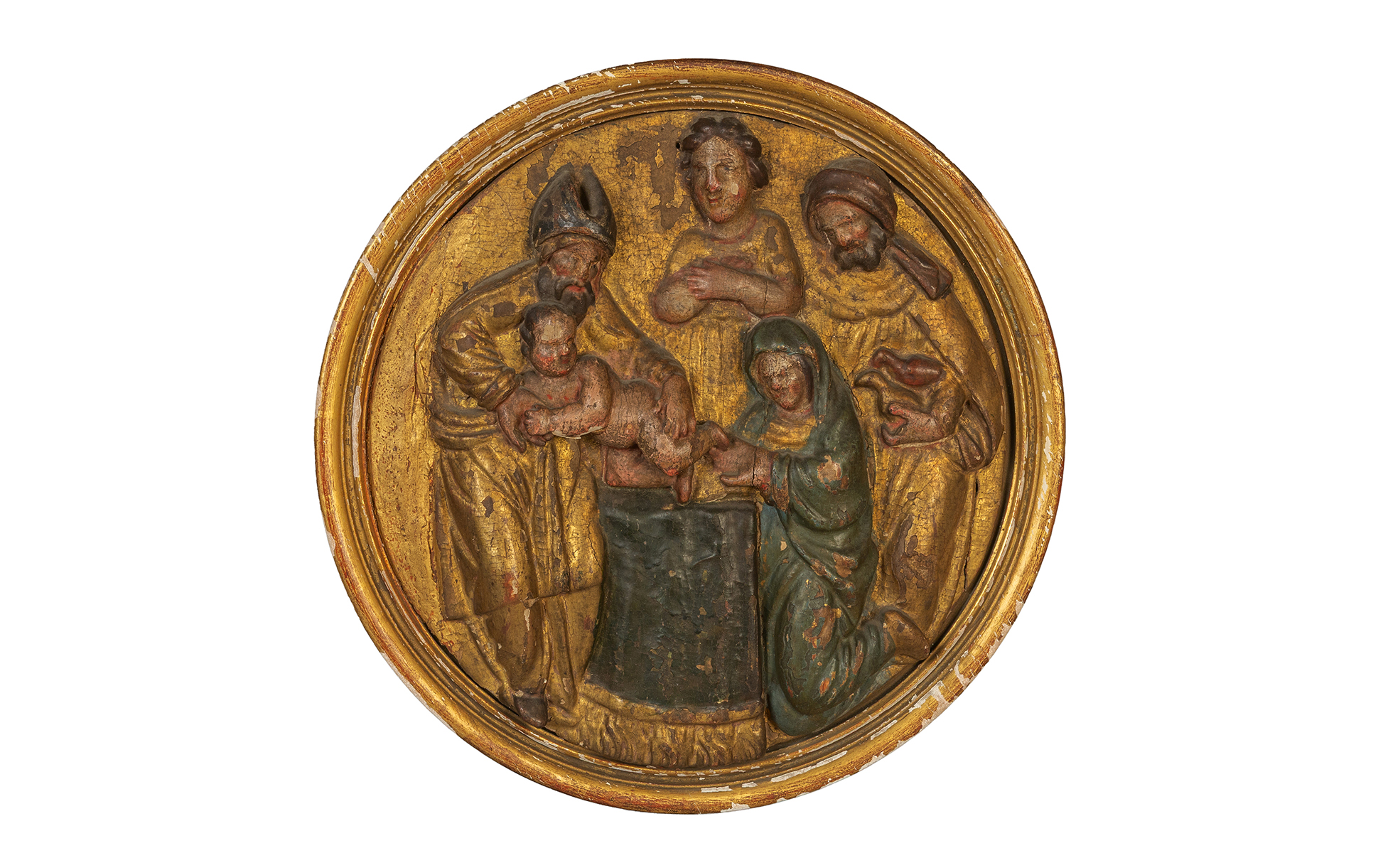 Sei sculture ad altorilievo di forma rotonda in legno dorato e policromato raffiguranti soggetti biblici Piemonte sec.XVII cornicette in legno dorato di epoca successiva