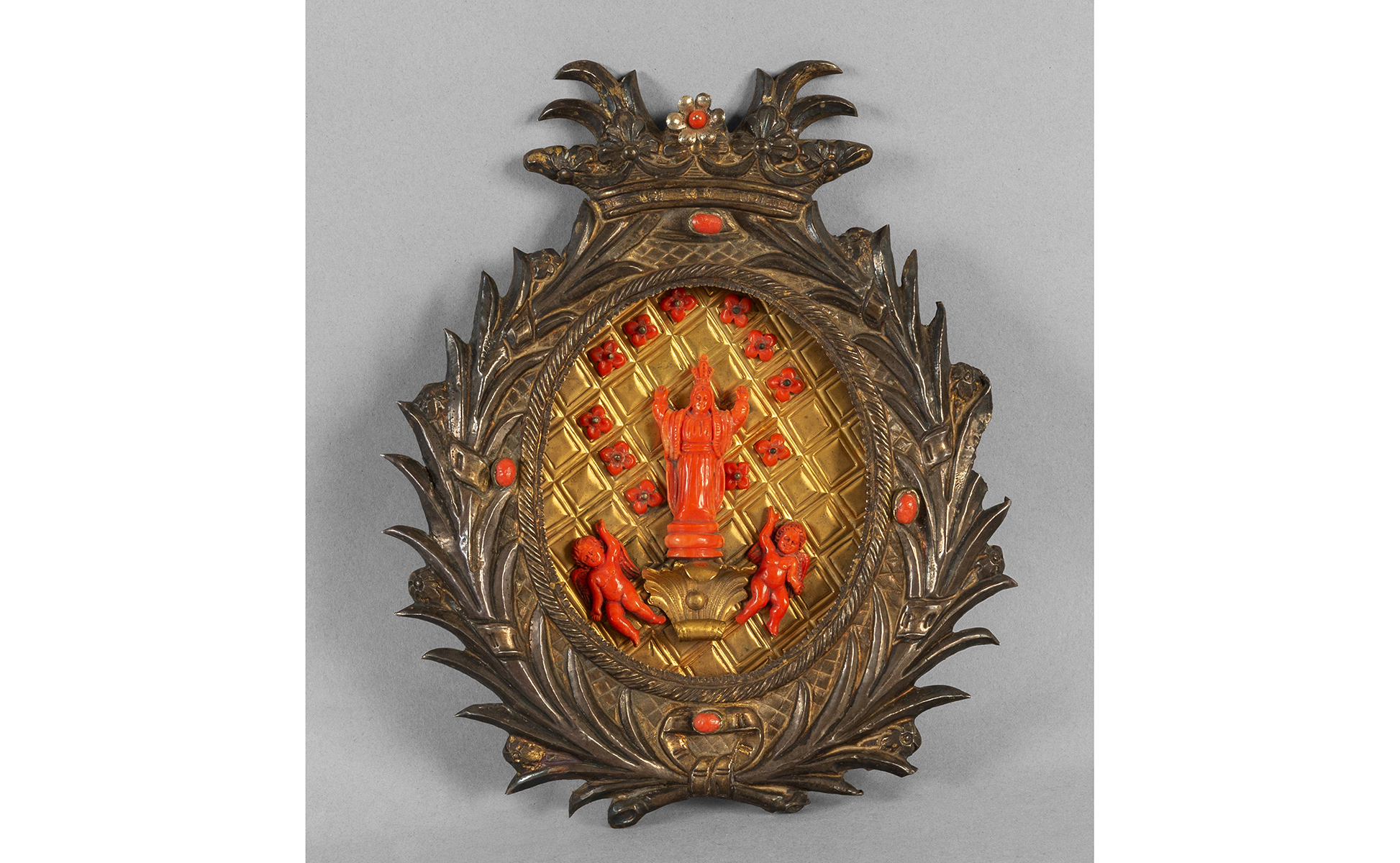 Maestranze trapanesi sec.XVIII 'Madonna Assunta con putti' scultura in corallo cornice in argento sbalzato con incastonate gocce in corallo