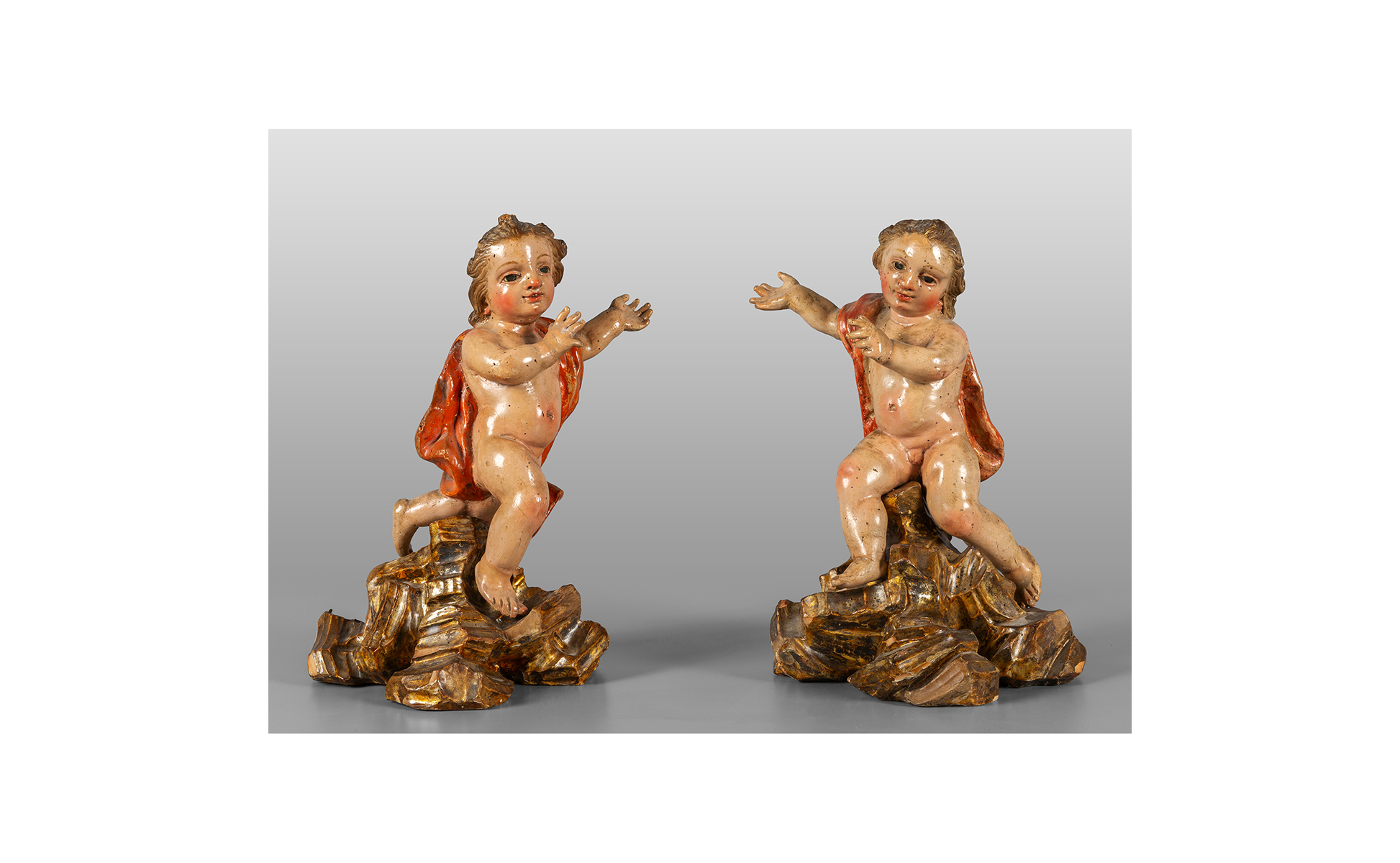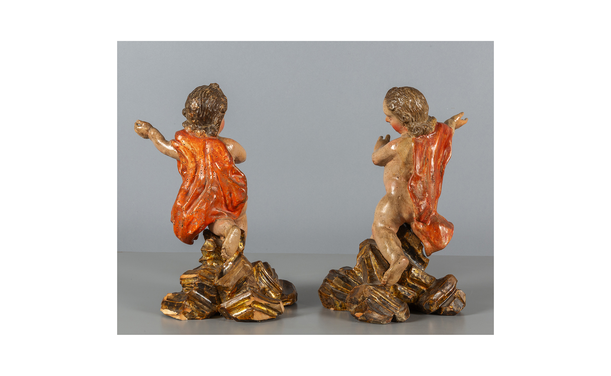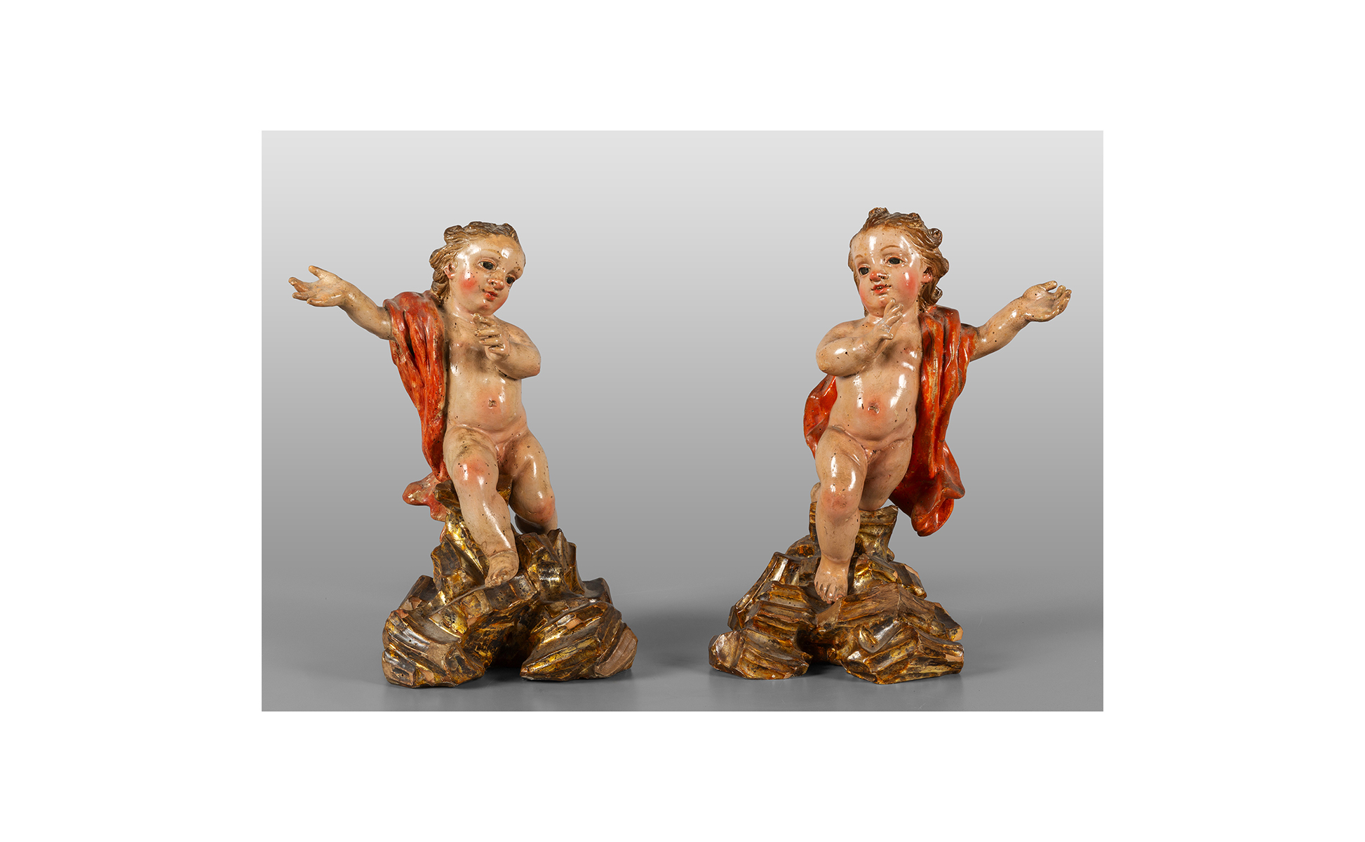 Coppia di putti in legno intagliato e policromato occhi in vetro poggianti su basi a roccaille in legno policromo Italia Meridionale sec.XVIII