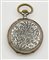 CASSA: in argento magistralmente lavorata a sbalzo e incisione; numero di cassa visibile sulla superficie interna di entrambi i fondelli; titolo e punzone (gallo) dell'argento presenti sulla superficie interna del fondello piu' esterno; sulla superificie esterna del fondello piu' interno inciso: "Remontoir/Cylindre 6 Rubis"