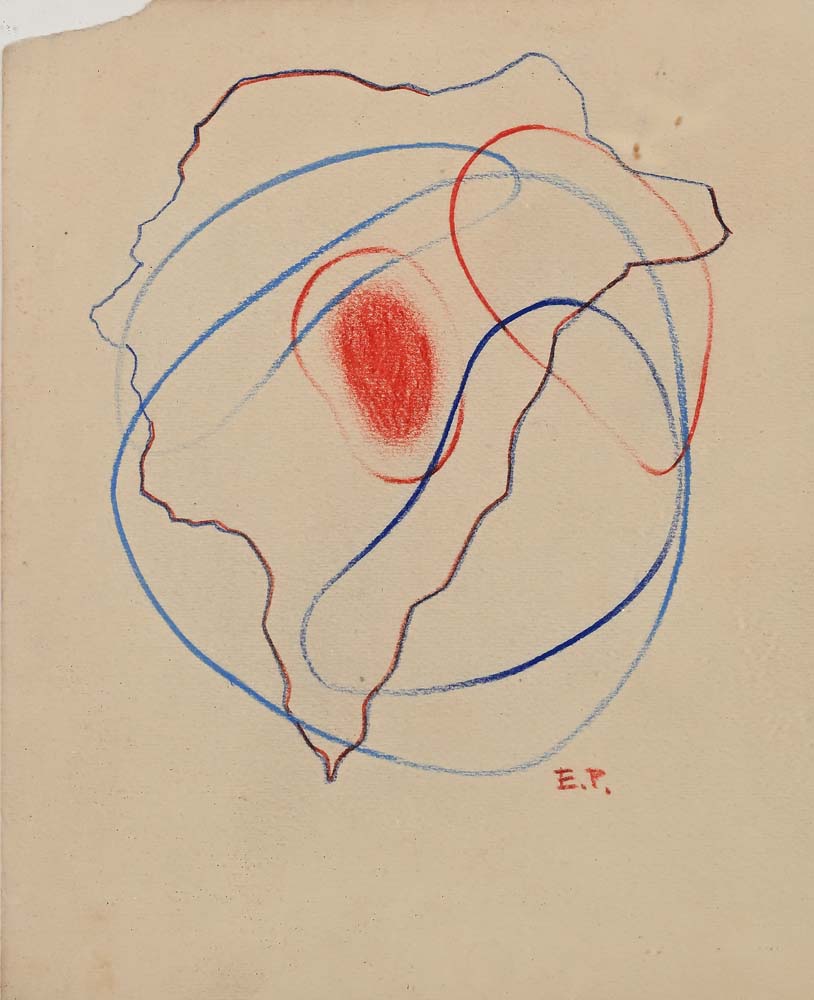 Composizione astratta Firma in monogramma "E.P." Matita e pastelli colorati su carta cm 23,5x19,4 - in cornice cm 47x36 Certificato di autenticità redatto e firmato di pugno dal Professor Massimo Prampolini