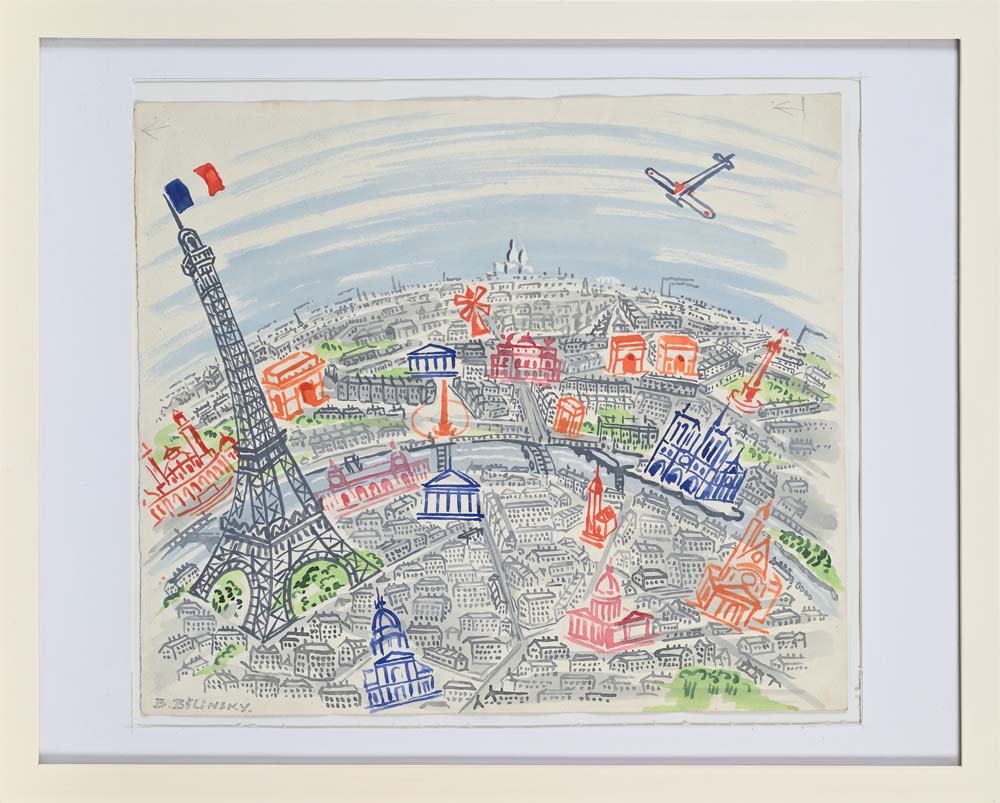 Parigi - Illustrazione per lo spettacolo Col Cappello sulle ventitrè, di Riccardo Morbelli 1945 Firma in basso a sinistra "B. Bilinsky" Acquarello su carta cm 33x38 - in cornice cm 43x53 Si ringrazia René Clementi-Bilinsky per le email di conferma dell'autenticità dell'opera e delle informazioni fornite riguardo al titolo e origine dell'opera