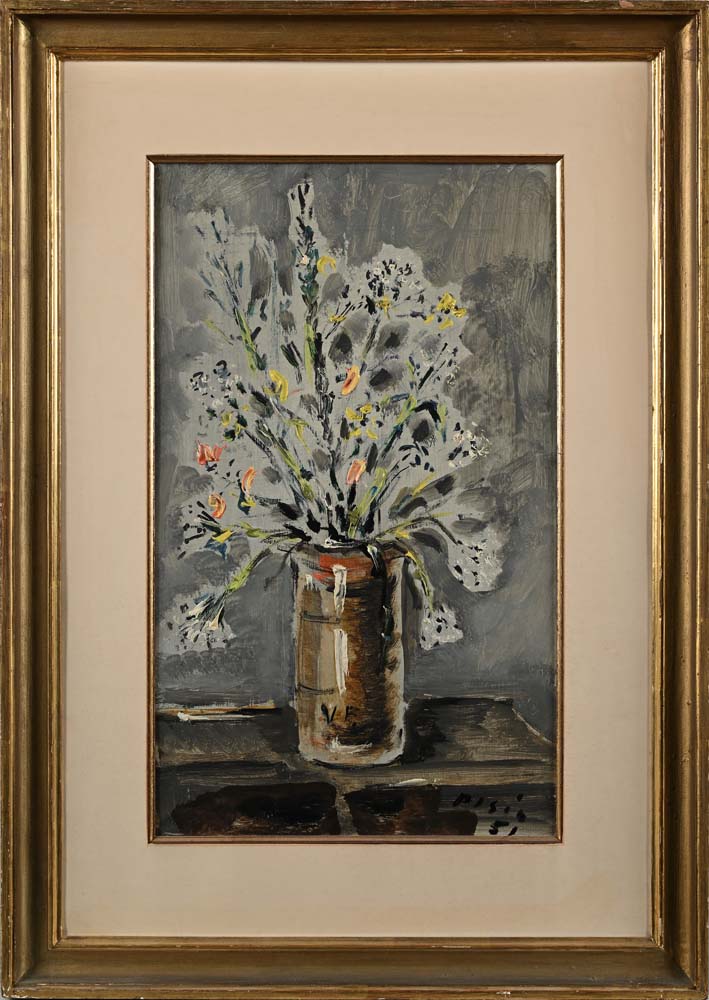 Vaso di fiori 1951 Firma e data in basso a destra "Pisis '51". Al verso reca etichetta della Galleria d'Arte Del Cavallino, Venezia Olio su cartone cm 50x30 - in cornice cm 70x50 Si ringrazia L'Archivio De Pisis per aver emesso un certificato che attesta l'archiviazione dell'opera nel 1997