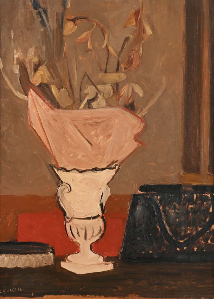 Natura morta con fiori Firma in basso a sinistra "C. Quaglia". Al verso titolo, firma e indirizzo dell'artista Olio su tavola cm 58x45 - in cornice cm 74x60 Coll. Eredi Gugliemo Battistoni, Roma