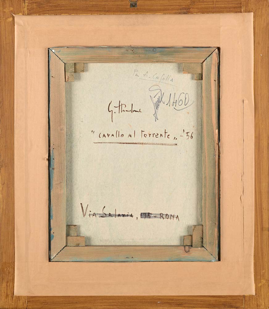 Cavallo al torrente 1956 Firma, titolo e data al verso "G. Stradone, Cavallo al torrente '56" Olio su tela cm 50x40 - in cornice cm 73x63