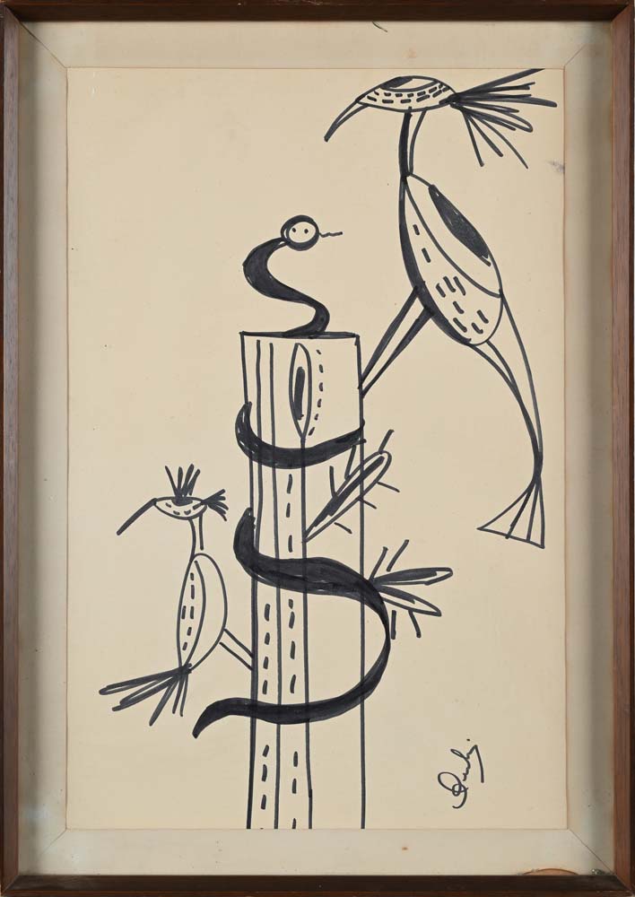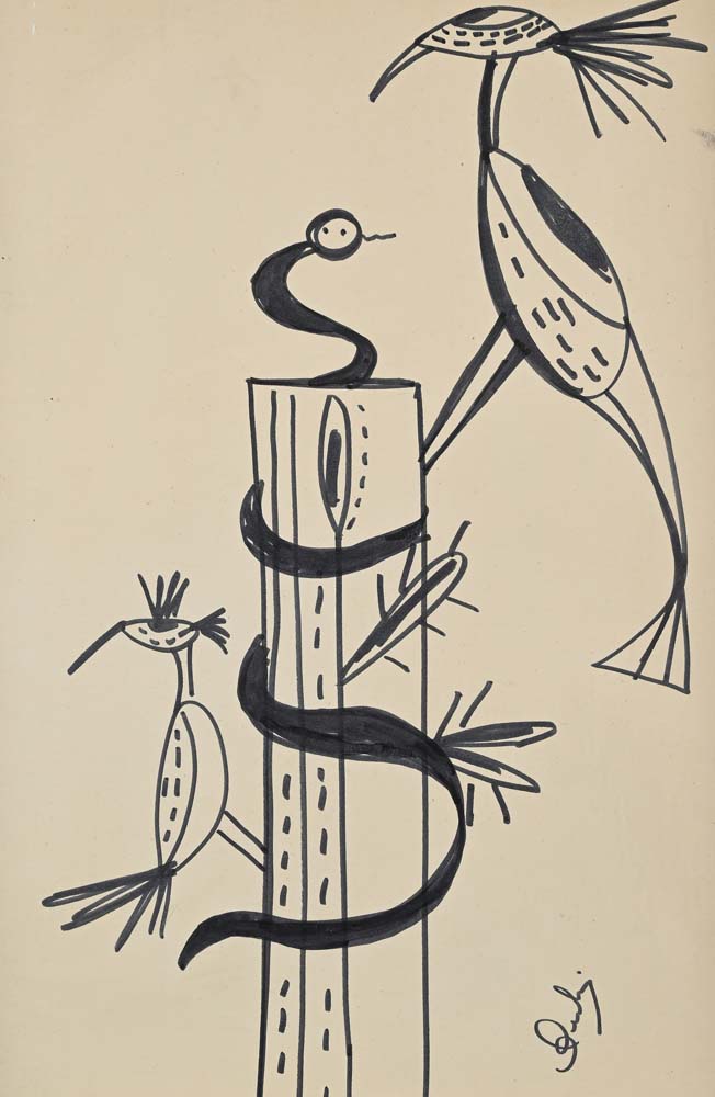 Serpente e uccelli al tronco Firma in basso a destra "Bertina" Pennarelli su carta cm 45x30 - in cornice cm 52x37