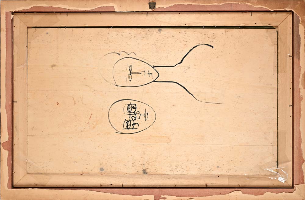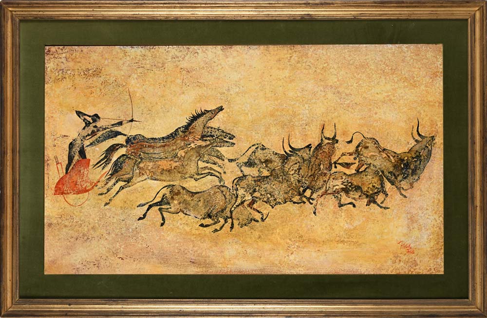 Il cacciatore etrusco 1966 Firma e data in basso a destra "Kalid 1966" Olio su tavola cm 55x96 - in cornice cm 75x114