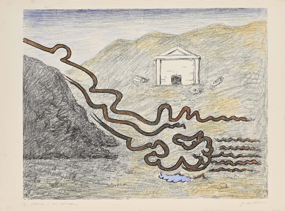 Fiume misterioso Firma e numerazione "G. De Chirico p.a. colorata a mano dall'autore". Litografia e acquarello su carta cm 51x70