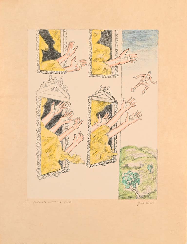 Le Mani Misteriose 1973 Firma e numerazione "G. De Chirico colorata a mano p.d.a." Timbro a secco "Giorgio De Chirico" e "Alberto Caprini stampatore in Roma".  Litografia e acquarello su carta japon cm 65x50