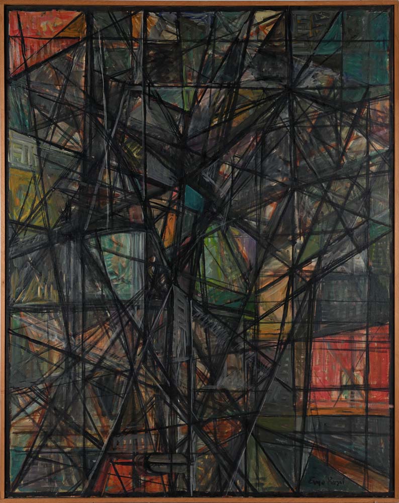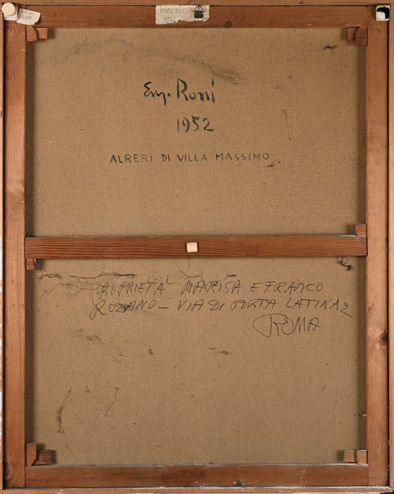 Alberi di Villa Massimo 1952 Firma in basso a destra "Enzo Rossi". Al verso reca firma, data e titolo "Enz. Rossi 1952, Alberi di Villa Massimo".  Olio su tela cm 100x80