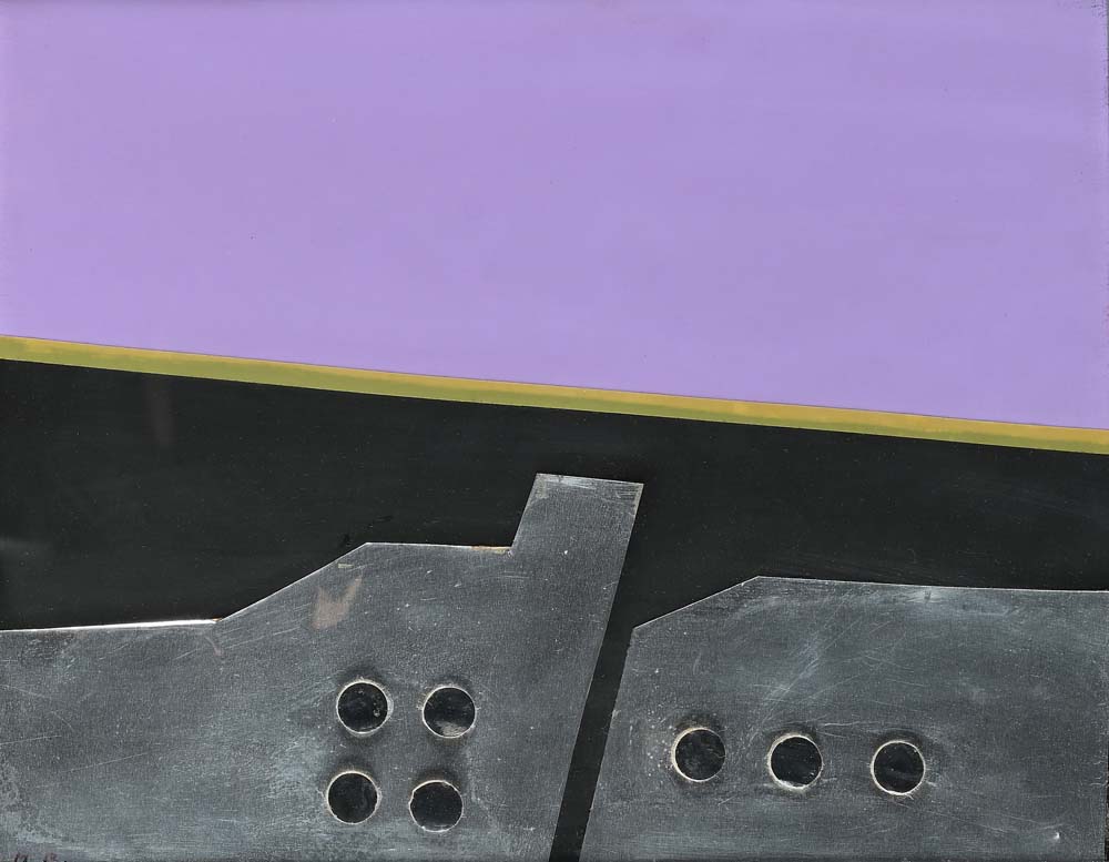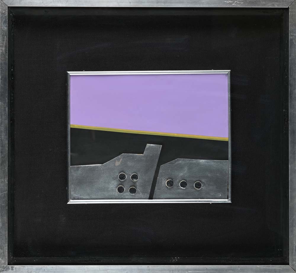 Città Metallica Monogramma in basso a sinistra "M.B.". Al verso reca etichetta della Galleria "Il Jolly, Roma". Acrilici e metallo su tela cm 24x30 - in cornice cm 50x56