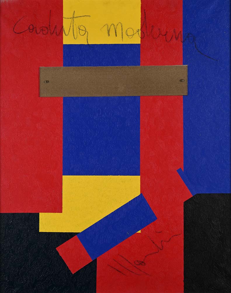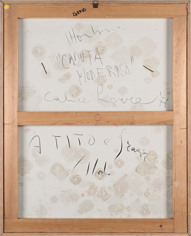 Caduta moderna 1971 Titolo e firma al fronte "Caduta Moderna, Mondino". Al verso reca titolo, firma, data e luogo Tecnica mista e plexiglass su tela cm 100x80 - in cornice cm 103x84 Certificato di autenticità su fotografia firmato di pugno dall'artista