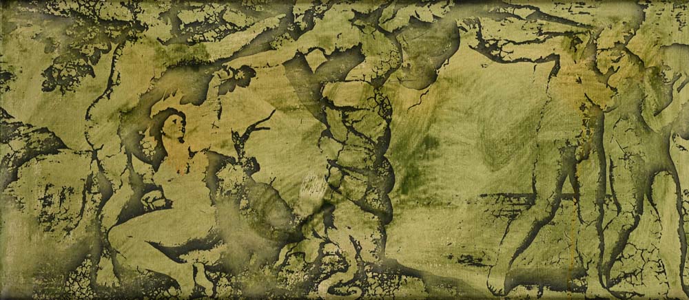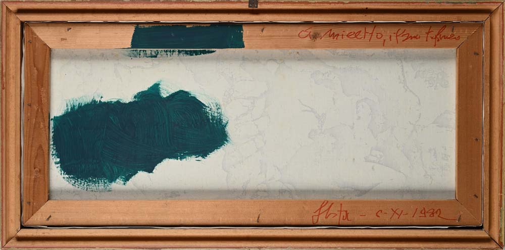 Dal Peccato Originale, 1982. Al verso firma e dedica sul telaio "Festa 6-XI-1982, A micetto, il suo..." Tela emulsionata cm 35x80 - in cornice cm 43x88