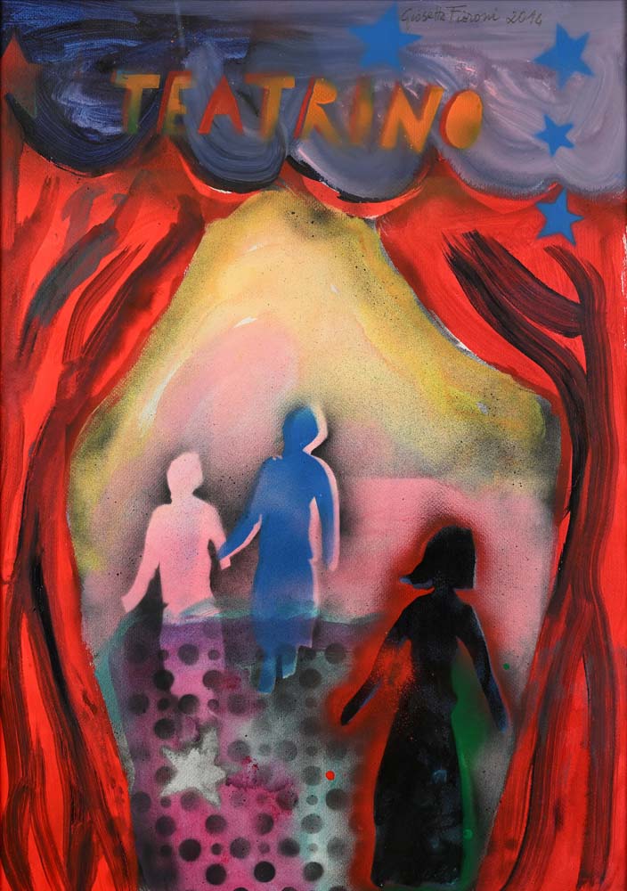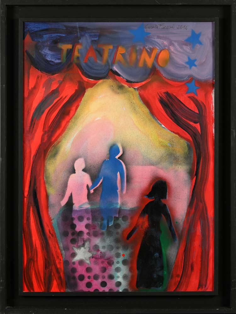 Teatrino 2014 Firma e data in alto "Giosetta Fioroni 2014" Spray, acrilici e smalti su carta cm 100x70 - in cornice cm 115x85 Certificato di autenticità su fotografia con firma di Giosetta Fioroni e timbro della Fondazione Goffredo Parise e Giosetta Fioroni
