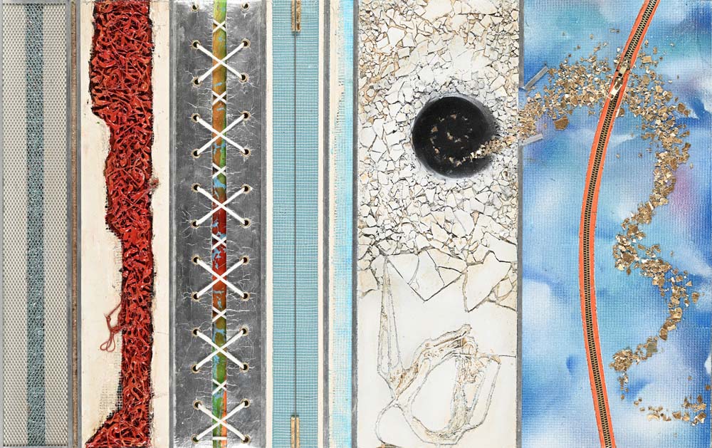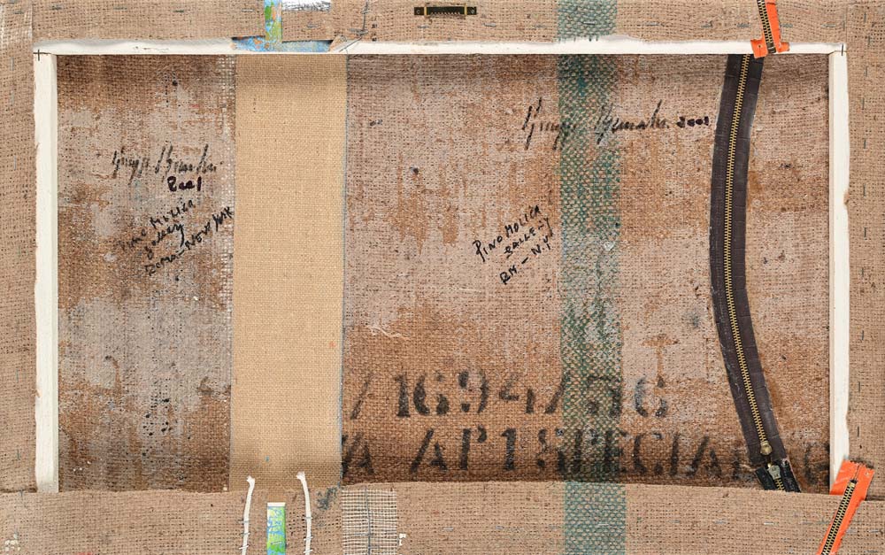 Codice B 2001 Firma e data al verso "Giuseppe Bernabei 2001" Polimaterico (griglie di metallo, lacci, zip, carta, metallo) e spray su tela di juta cm 50x80