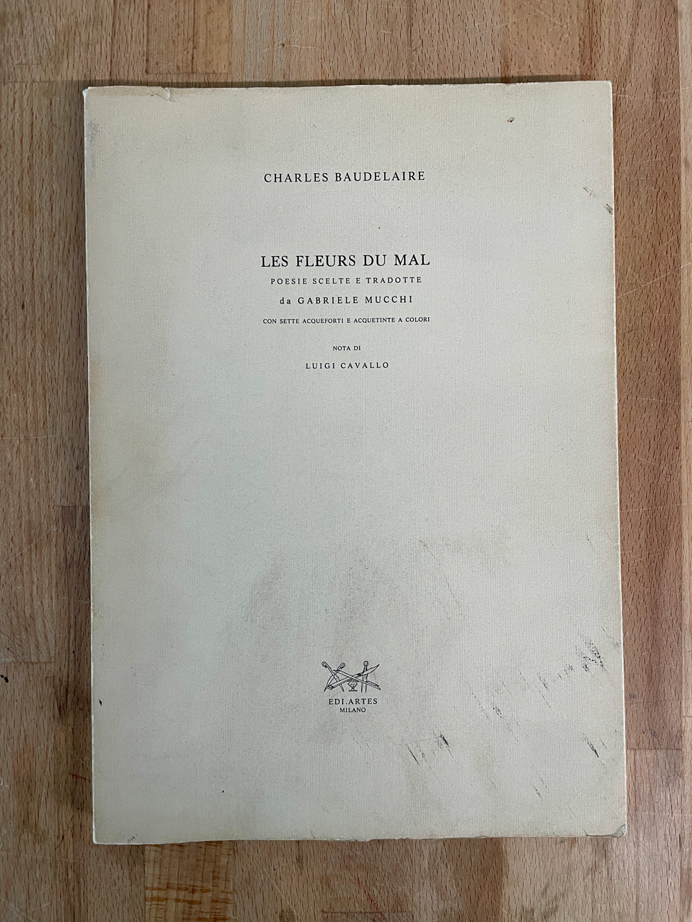 Edizione d'arte con il testo de 'Les fleurs du mal' di Charles Baudelaire, poesie scelte e tradotte da Gabriele Mucchi e 7 riproduzioni di acqueforti e acquetinte a colori dell'Artista