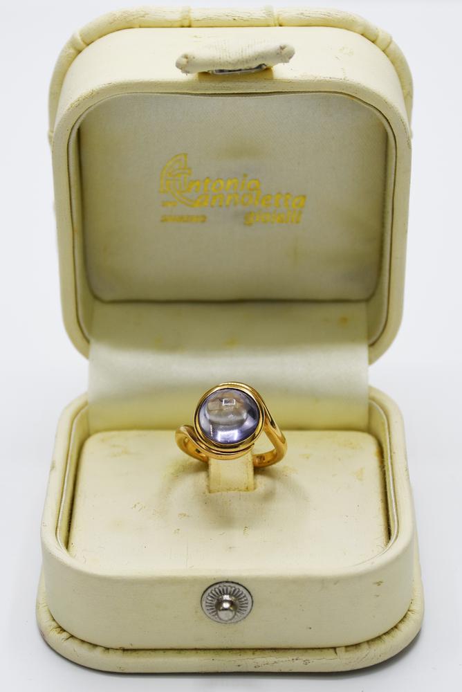 elegante anello in oro giallo con ametista cabochon su montatura a contrariè