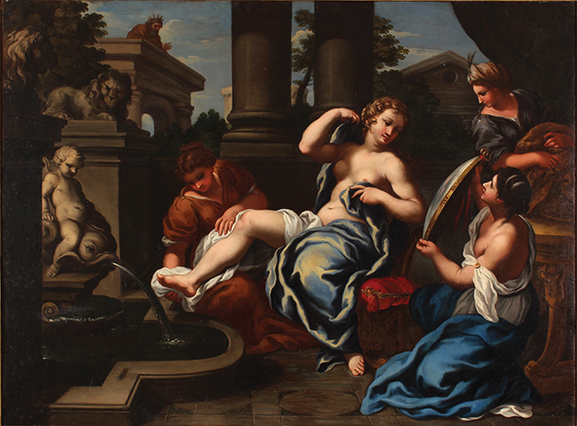 GIUSEPPE BARTOLOMEO CHIARI (attr.) Roma 1654 - 1727 Il bagno di Betsabea olio su tela, cm 110 x 150 Il dipinto mostra caratteri tipici del tardo cortonismo romano, vena mescolata anche a una ripresa di stilemi classicisti che vanno dal Sacchi fino al Reni, Annibale Carracci, Maratta. La costruzione simmetrica e bilanciata delle figure e il loro perfetto accordarsi alle architetture di fondo, dove dominano due colonne e, a sinistra, una fontana con un putto sopra un delfino, ne fa un’opera armonica e tipicamente romana. Queste caratteristiche inducono a pensare che la tela in oggetto possa essere riferita al Chiari, allievo appunto del Maratta, in una fase giovanile e maggiormente cortonesca collocabile nell’ultimo ventennio del XVII secolo. Confronti possibili sono con opere note del Chiari come la Susanna e i Vecchioni al Walters Art Museum di Baltimora, il Riposo dalla fuga in Egitto al Bob Jones University Museum and Gallery di Greenville (SC) e una bella figura femminile allegorica segnalata nella fototeca Zeri al n.47965. Il dipinto è in perfetto stato di conservazione.