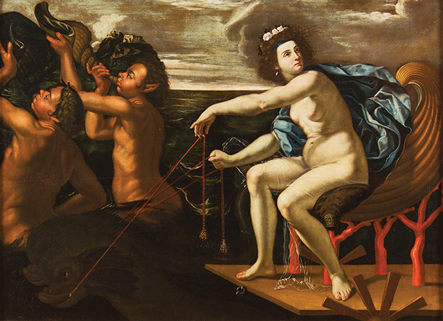 GIOVANNI FRANCESCO GUERRIERI da Fossombrone Fossombrone 1589 - Pesaro 1656 Anfitrite sul carro Olio su tela, cm 180 x 120 Perizie autografe di Andrea Emiliani, Mina Gregori e Daniele Benati Il dipinto si può considerare un capolavoro del maestro marchigiano Guerrieri da Fossombrone, tipico del proficuo periodo romano che va dal 1615 al 1618 quando il maestro era impegnato nella nota decorazione del palazzo Borghese commissionata dal principe Marcantonio, interamente tratta dalla Iconologia di Cesare Ripa. Guerrieri aveva nel 1615 solo venticinque anni, e veniva da una commessa molto importante nella chiesa di Santa Maria del Piano del Ponte a Sassoferrato. Da quelle straordinarie invenzioni formali trae origine il nostro dipinto, che dovrebbe raffigurare una Anfitrite sul carro, seduta su una grande conchiglia sorretta da quattro rami di corallo puro; all’estremità sinistra due tritoni suonano corni. L’intonazione della composizione è molto manierata e fortissimo è l’influsso di un caravaggismo pacato di prima battuta che risente soprattutto del primo Reni e della cultura senese del Gramatica. La figura di Anfitrite, solida e classica nella movenza, si potrebbe considerare un perfetto connubio tra classicismo reniano e primo caravaggismo romano, in un’epoca in cui le due anime forti della cultura barocca convivevano con esiti assai differenti. Emiliani sottolinea come la composizione possa essere memore della figura del Carro delle Ore sulla volta del casino Pallavicini Rospigliosi al Quirinale, caposaldo dell’attività del Reni. Il dipinto è in ottimo stato di conservazione.