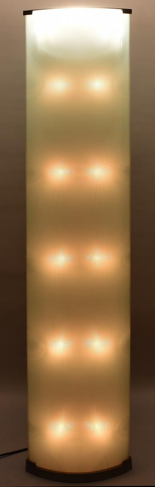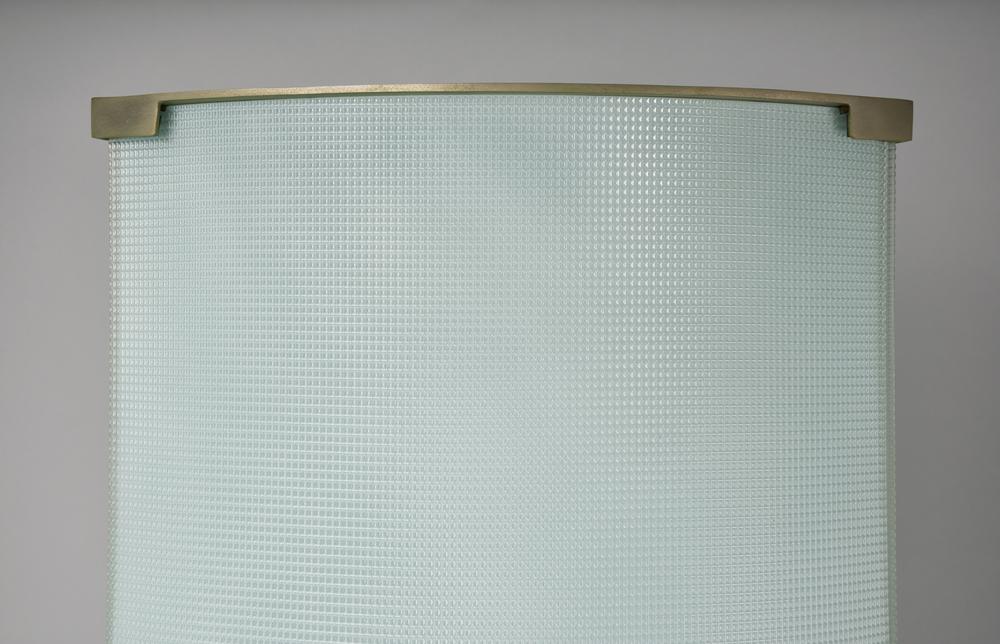 lampada da terra con struttura in ottone nichelato satinato e due diffusori in vetro stampato e curvato