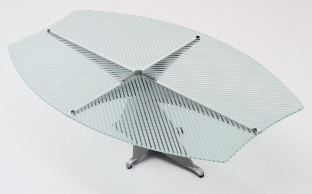 tavolo di gusto post-modernista con struttura in metallo e ripiano in vetro con motivo acidato al lato inferiore