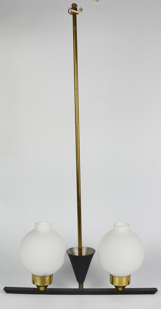 struttura in ottone e metallo con due fuochi con campana in vetro opalino bianco