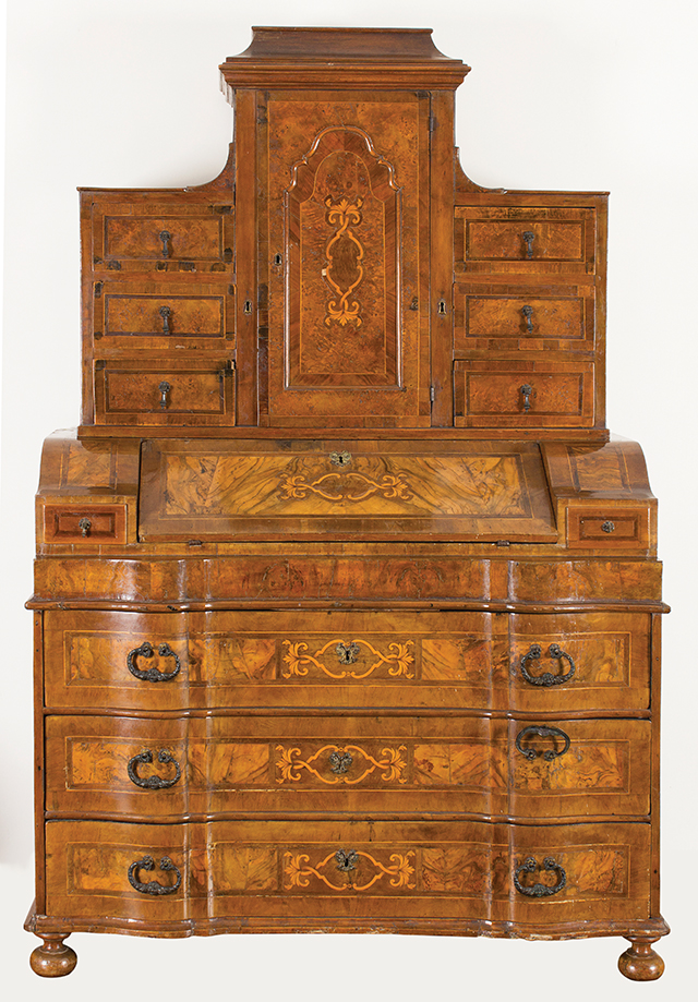 TRUMEAU VENETO XVIII SECOLO a due corpi, placcato in ulivo, noce e radica di noce, con parte superiore a tabernacolo con tre cassetti laterali. Parte inferiore a ribalta con tre cassetti mossi con intarsi decorativi. Gambe a cipolla Miisure cm 190 x 90 x 60