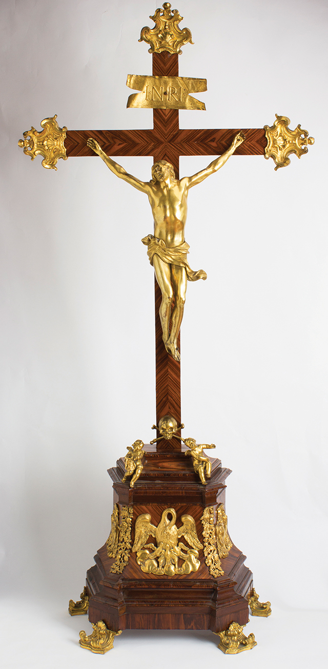 Maestri ebanisti e bronzisti romani Dal prototipo di Gian Lorenzo Bernini per la Basilica di San Pietro in Vaticano Crocifisso Bronzo dorato e palissandro, allezza cm. 135 Questa stupenda croce d’altare, recante lo stemma cadinalizio dei Conti Negroni ai lati, deriva, come espresso da Alvar Gonzalez-Palacios, da uno dei due tipi di crocifissi realizzati dal Bernini per gli altari della basilica di San Pietro. I crocifissi vennero palasmati in cera da Ercole Ferrata nel 1659 sotto la supervisione del Bernini stesso e ancora oggi si trovano al loro posto. Se il crocefisso è diretta derivazione berniniana le caratteristiche della base rientrano nel pieno settecento romano, sia nel lavoro di ebanisteria in bois de violette e bois de rose sia nelle raffinatissime rifiniture in bronzo dorato. L’opera è in perfetto stato di conservazione