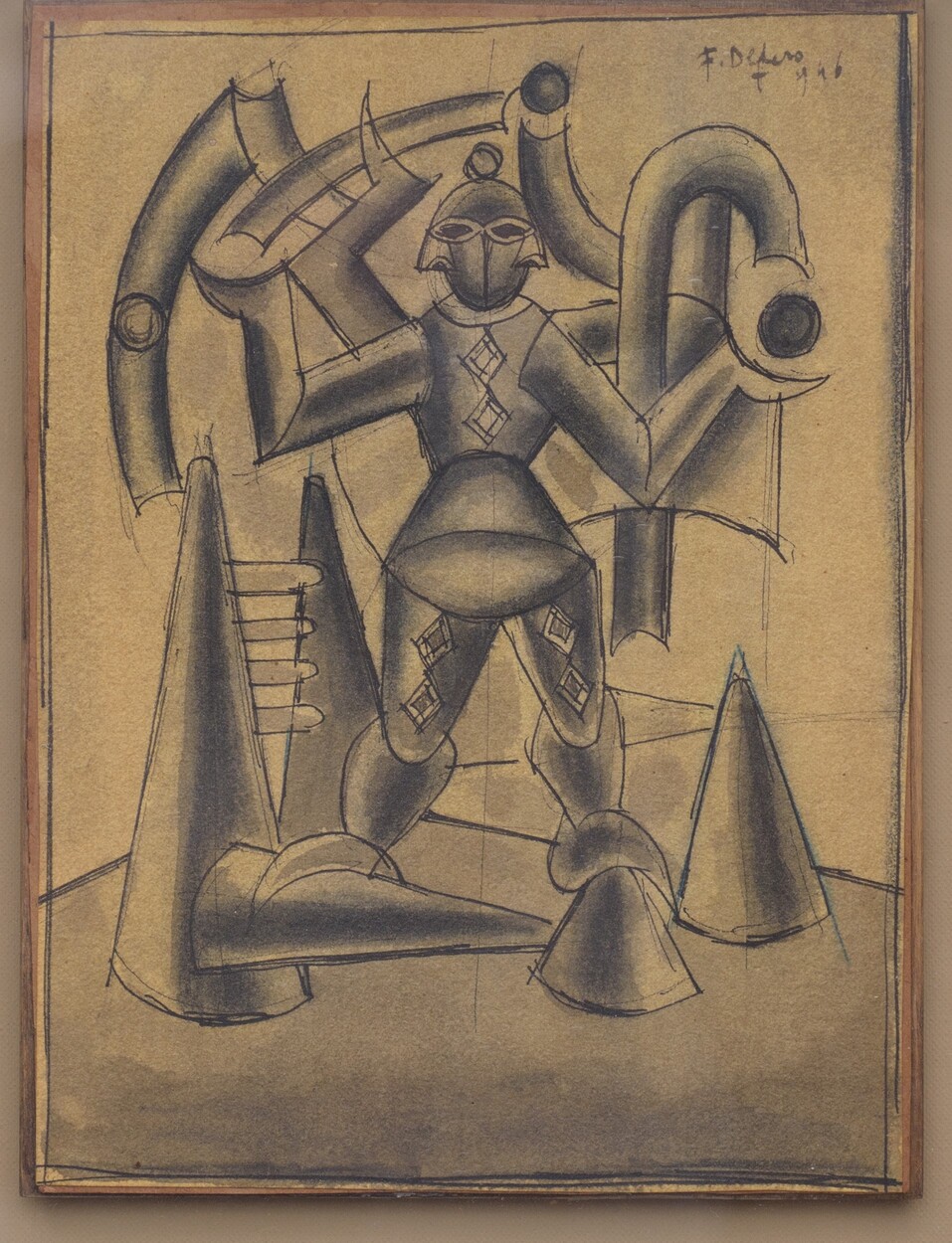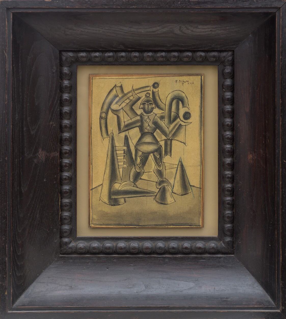 matita, carboncino e china diluita su carta 26 x 19,5 cm. Opera firmata e datata in alto a destra "F. Depero 946". Recante iscrizione al retro della moglie Rosetta Depero: "Al ricordo del mio grande scomparso Rosetta Depero Rovereto 24-6-1967". In cornice.