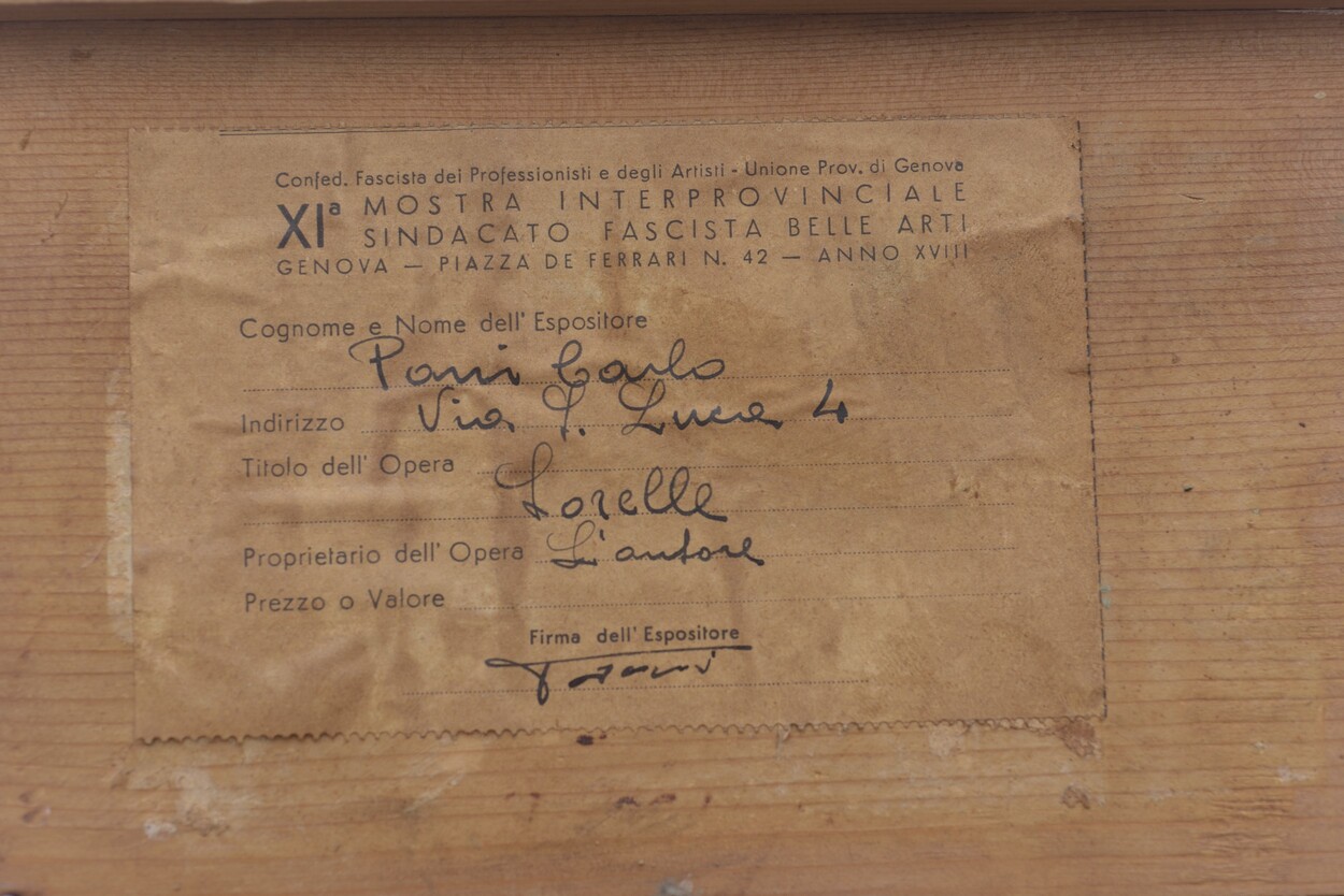 olio su tela 70 x 76 cm. Firmato e datato al centro a destra: C. Parri 1940 XVIII. Al retro reca etichetta: XI Mostra interprovinciale sindacato fascista belle arti. Genova anno XVIII. In cornice.