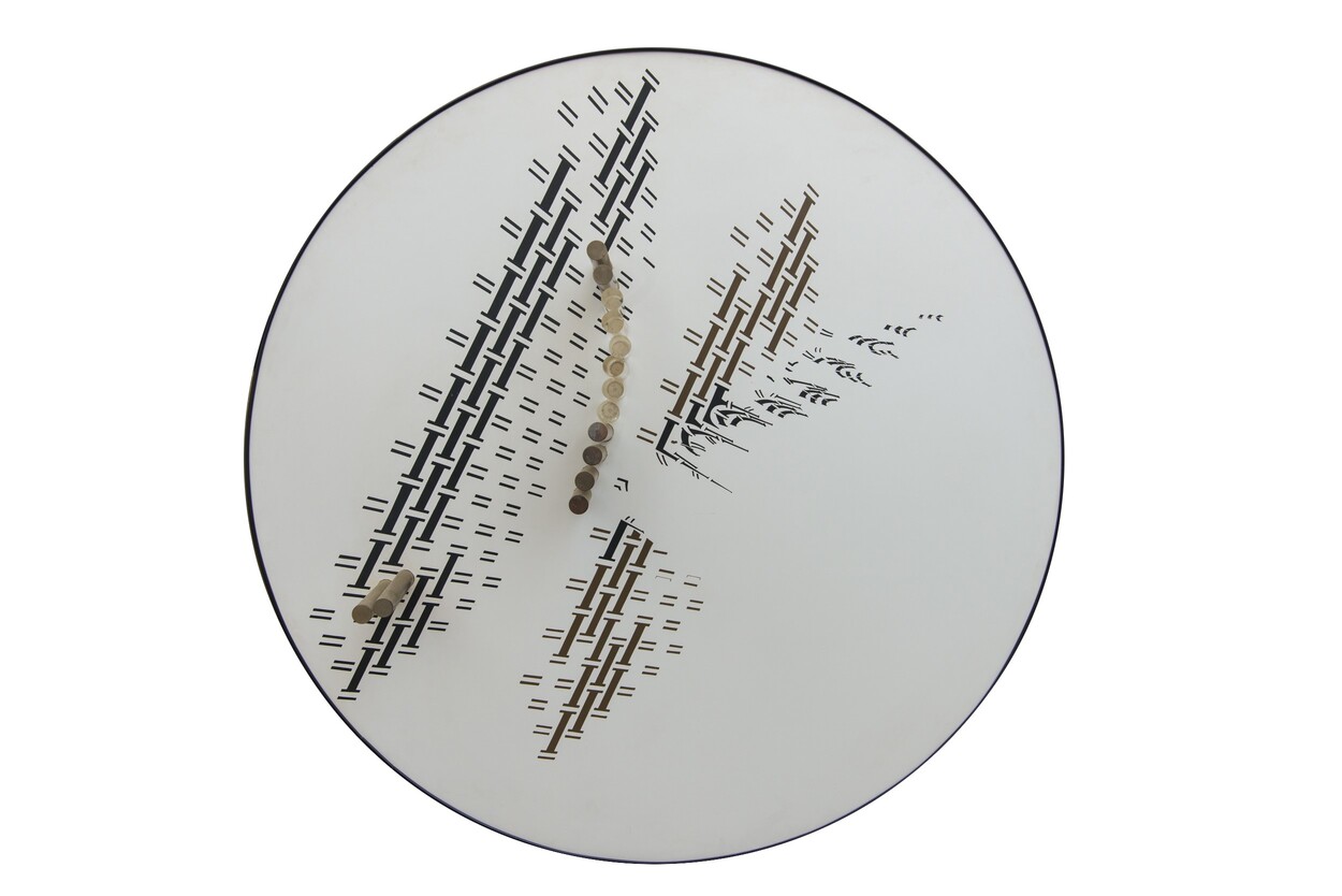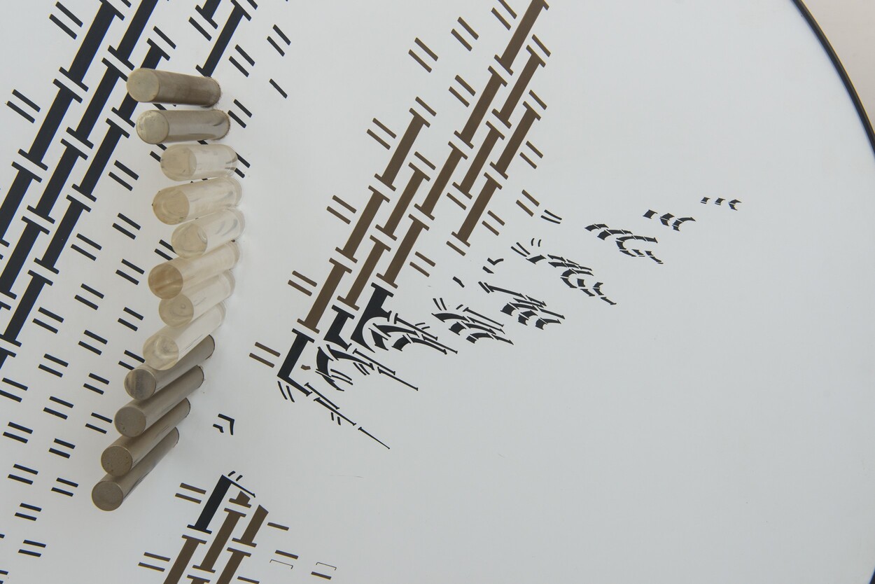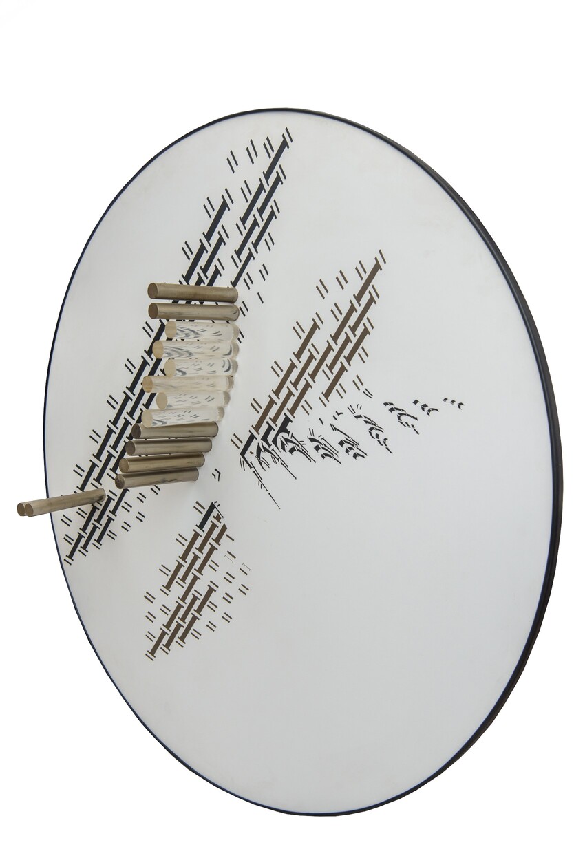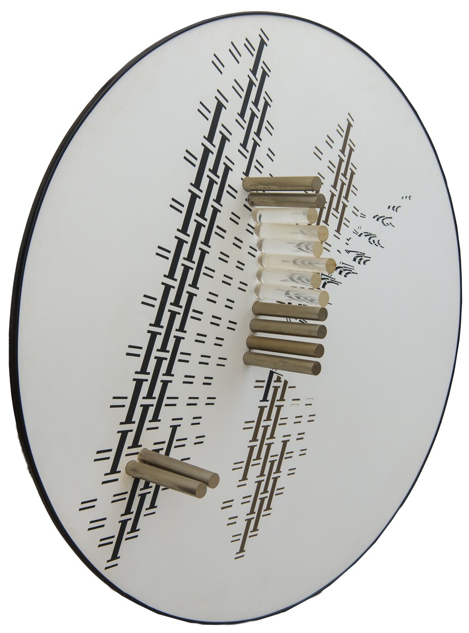 tecnica mista e cilindri in plexiglass e metallo su tavola D. 130 x P. 21,5 cm.