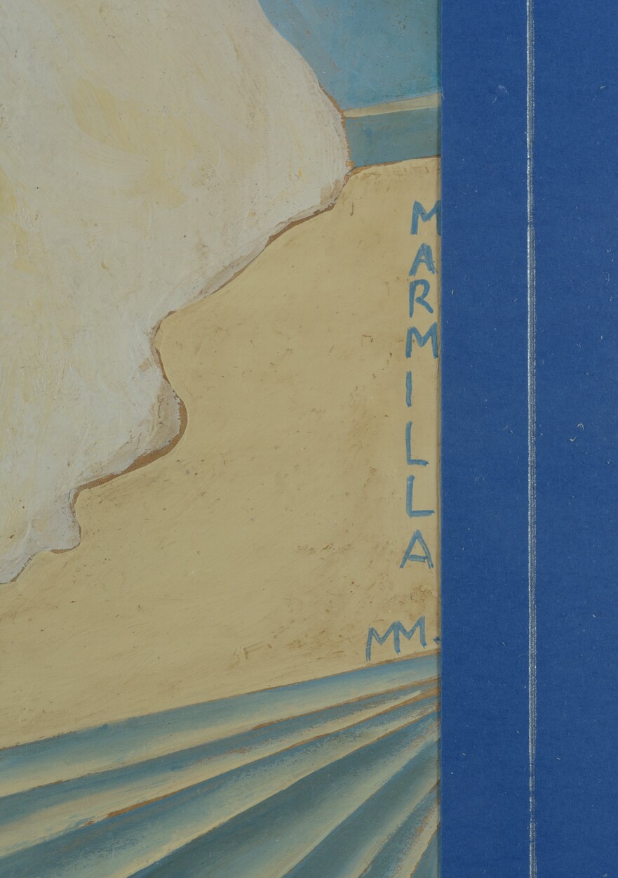 olio su carta applicata su tela 30 x 44 cm. Iscrizioni sulla sinistra. Firma al centro sulla destra. In cornice. Al retro timbro di provenienza.