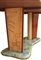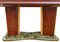 legno di palissandro, marmo verde delle alpi e ripiano in vetro. Base con due lesene ai lati in acero scolpite, con tematiche allegoriche. Su basamento in marmo profilato in ottone.