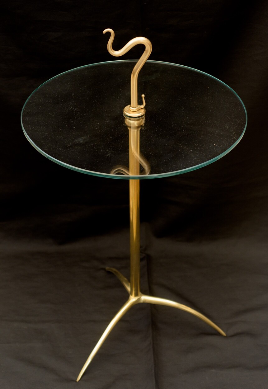 ottone e vetro H, 71 x D 41 cm. Struttura e piedi in ottone, piano in cristallo molato e sagomato.