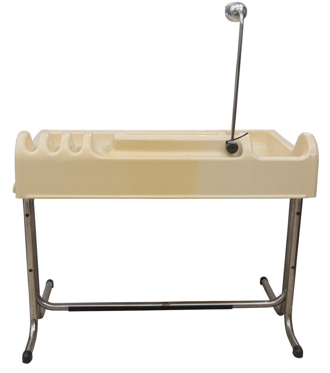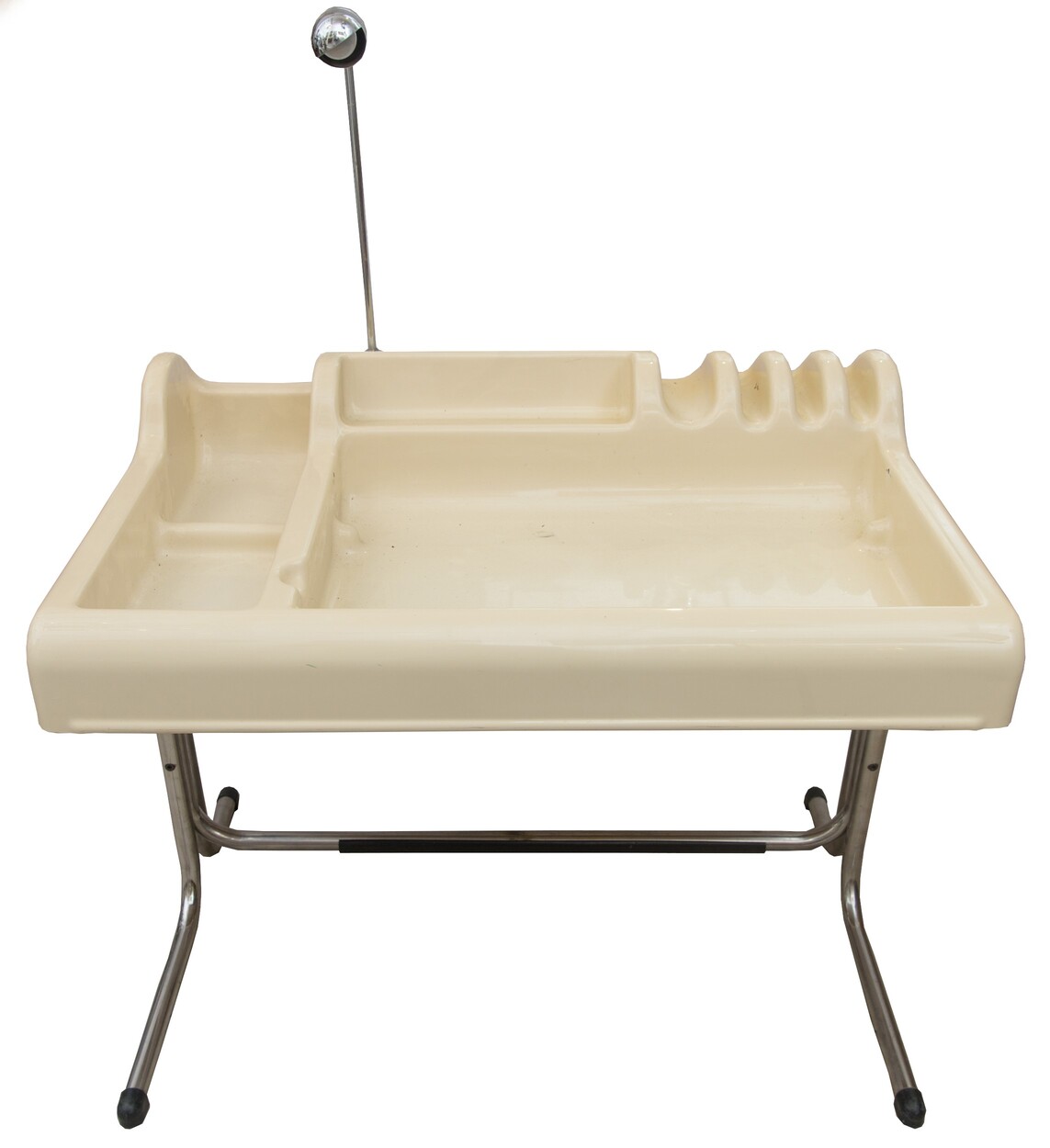 metallo cromato e plastica 82 x 100 x 63 cm. Produzione Molteni. Lampada orientabile. Ripiano in vetro mancante; difetti.