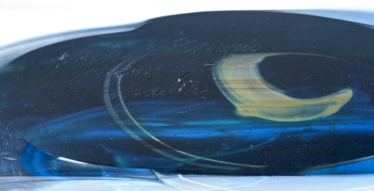 vetro 27 x 23 x 3 cm. Decorato con fascette di cristallo trasparente. Firma incisa alla base: "Michael Harris Mdina Glass Malta".