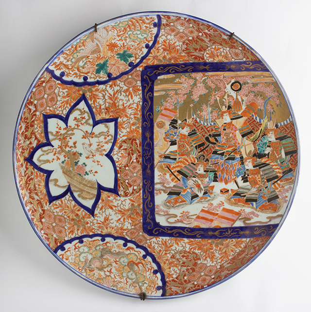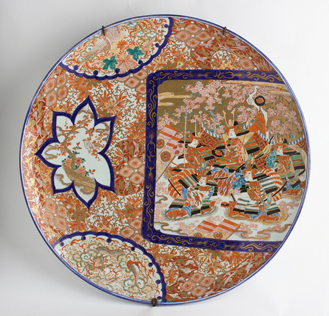 COPPIA DI GRANDI PIATTI IMARI dipinti a smalto con inserti a foglio d’oro raffiguranti soldati imperiali con decori floreali, cm 61 Giappone fine XIX sec. ottimo stato di conservazione