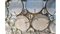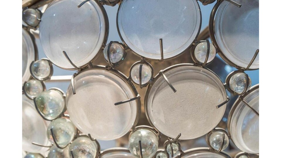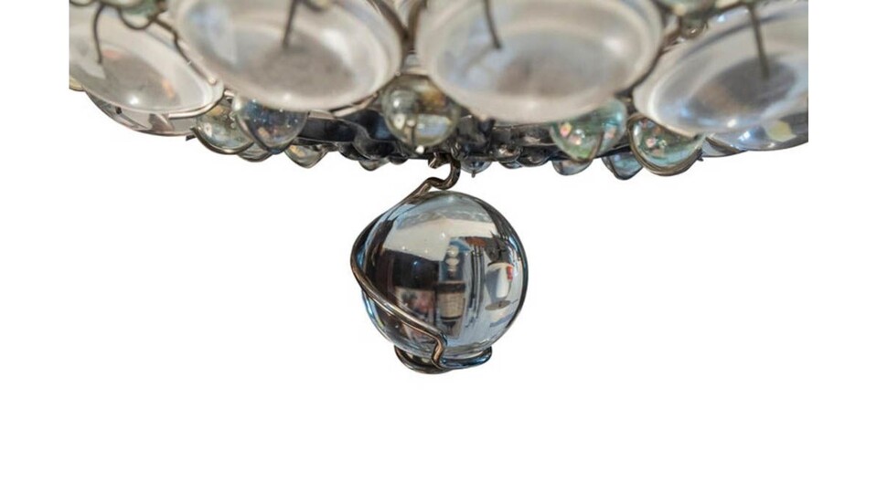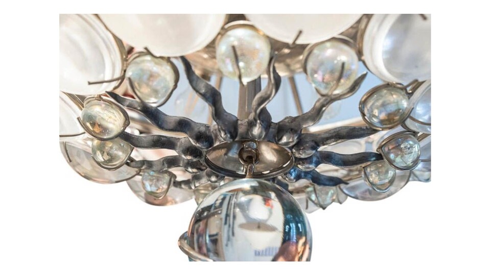 70 cm (h) x 80 cm (diametro). Lampadario in metallo e vetro.