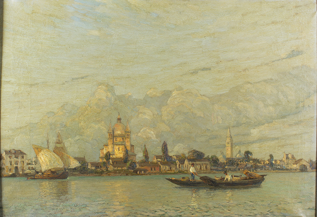 CAMILLO BORTOLUZZI Treviso 1868 – Dolo 1933 San Giorgio a Venezia, 1900 ca. Olio su tela, cm 71 x 104 Firma in basso a sinistra Cornice dorata e intagliata XIX secolo Provenienza Collezione Ciardi Villa Baciocchi, Villa Vicentina Collezione privata Villa Baciocchi, Villa Vicentina