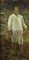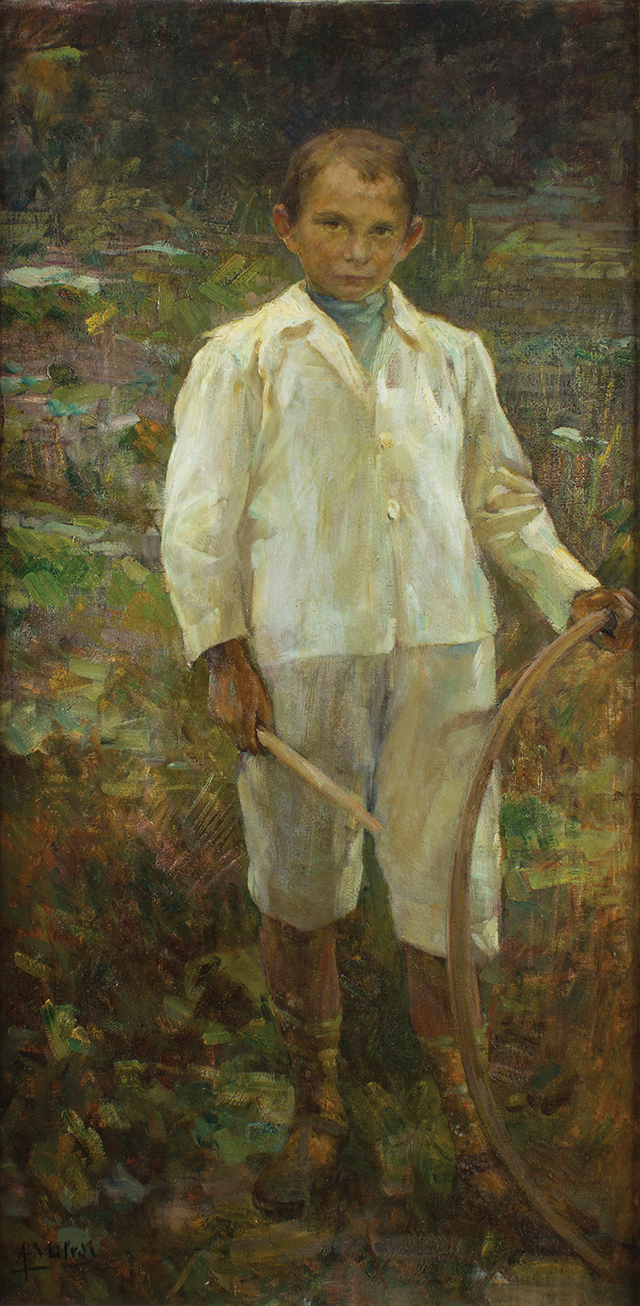 ALESSANDRO MILESI Venezia 1856 - 1945 Ragazzo con gioco del cerchio su sfondo di campagna Olio su tela, cm 140 x 67 Firma in basso a sinistra Provenienza Collezione Ciardi Villa Baciocchi, Villa Vicentina Collezione privata Villa Baciocchi, Villa Vicentina