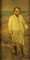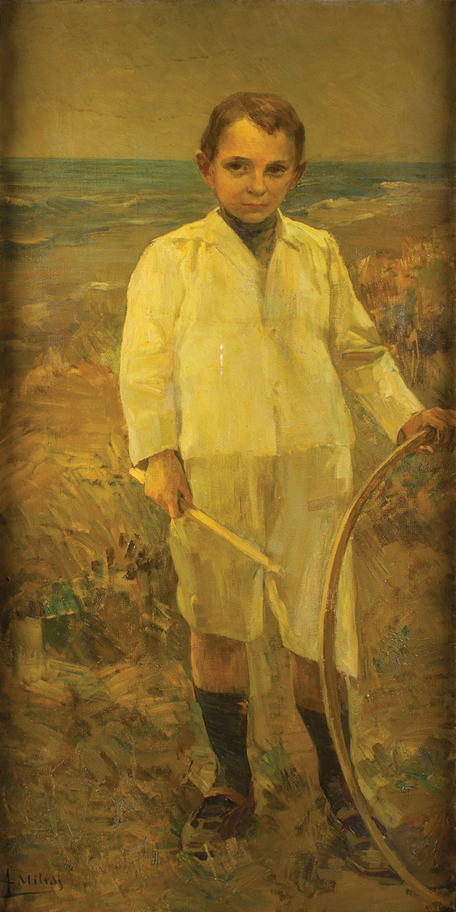 ALESSANDRO MILESI Venezia 1856 - 1945 Ragazzo con gioco del cerchio su sfondo di mare Olio su tela, cm 140 x 67 Firma in basso a sinistra Provenienza Collezione Ciardi Villa Baciocchi, Villa Vicentina Collezione privata Villa Baciocchi, Villa Vicentina