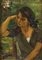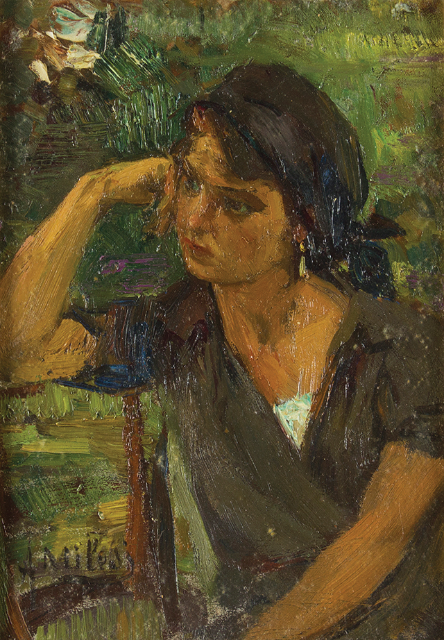 ALESSANDRO MILESI Venezia 1856 - 1945 Donna pensosa Olio su tavoletta, cm 27 x 19 Firma in basso a sinistra Cornice dorata e intagliata Provenienza Collezione Ciardi Villa Baciocchi, Villa Vicentina Collezione privata Villa Baciocchi, Villa Vicentina