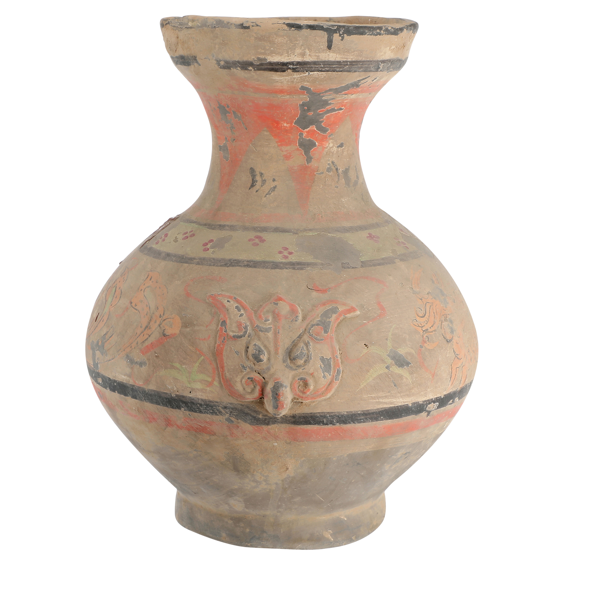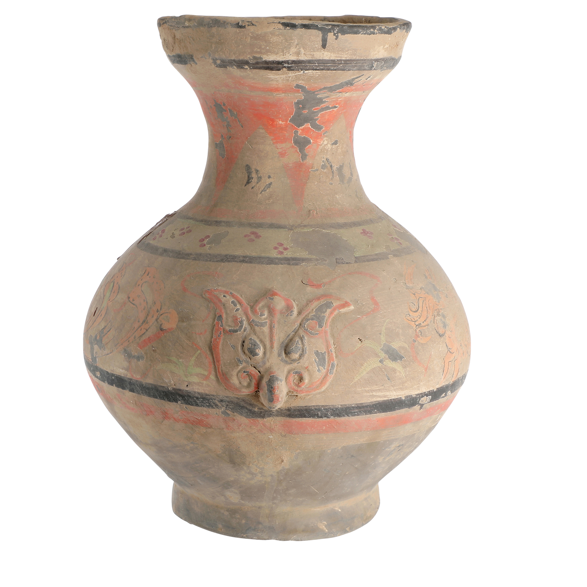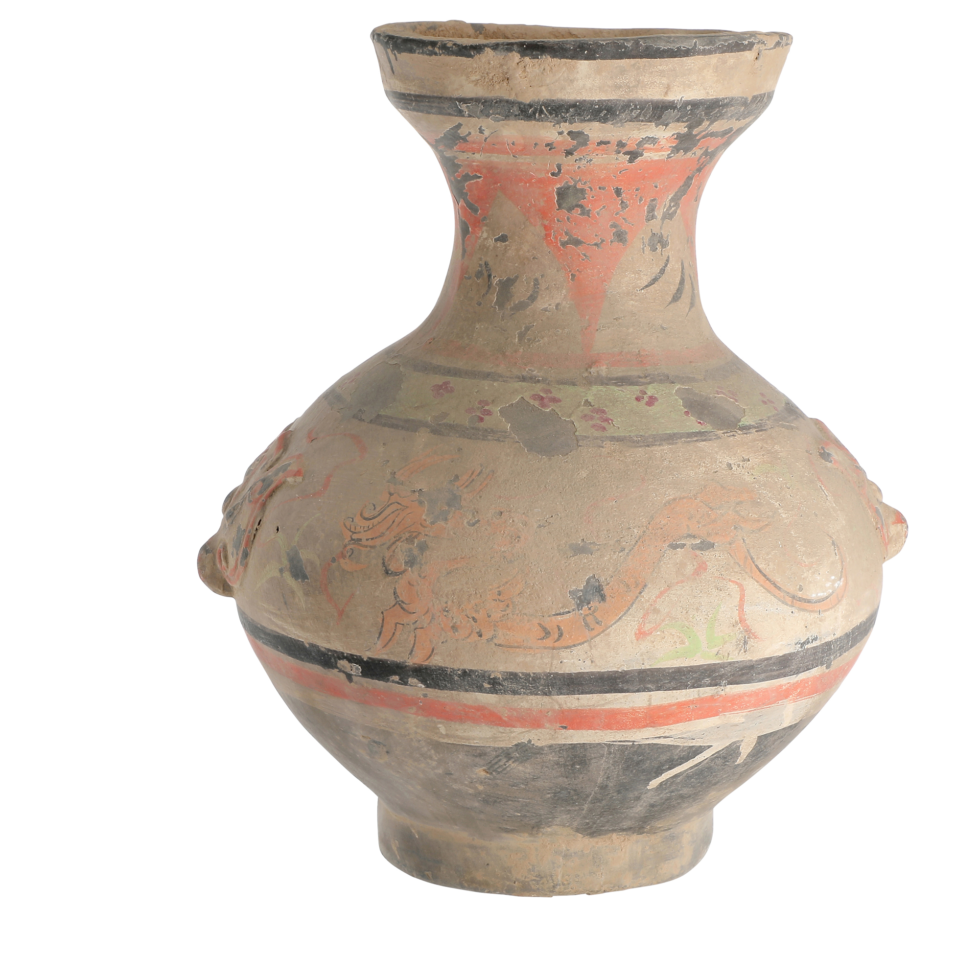 Riproduzione in stile Zhou di vaso di tipo Hu, con decoro policromo di draghi e motivi geometrici e prese, a rilievo, in forma di mascheroni.