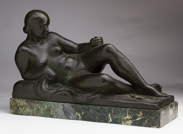 SCULTORE NORD EUROPEO INIZI XX SECOLO Donna sdraiata con mela Scultura in bronzo a patina verde scuro Misure cm 25 x 42 x 16 Siglata M.P. all’angolo al retro Base in marmo verde di Carrara
