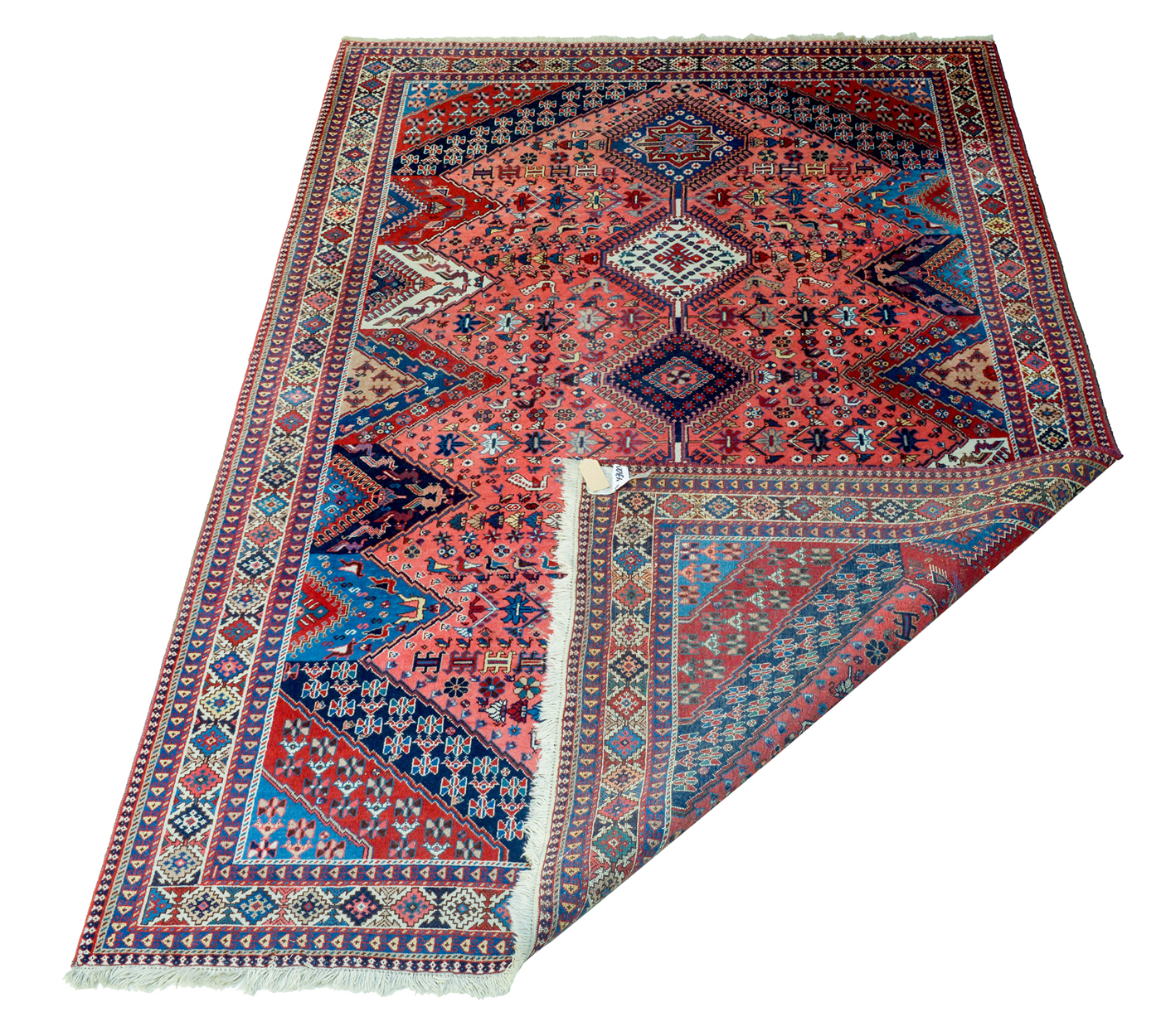 Buon esemplare della regione del Fars, con cinque losanghe dal profilo uncinato incolonnate sull’asse centrale e numerosi ornamenti minori tra cui piccoli uccelli stilizzati.