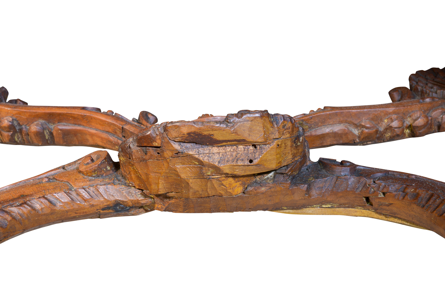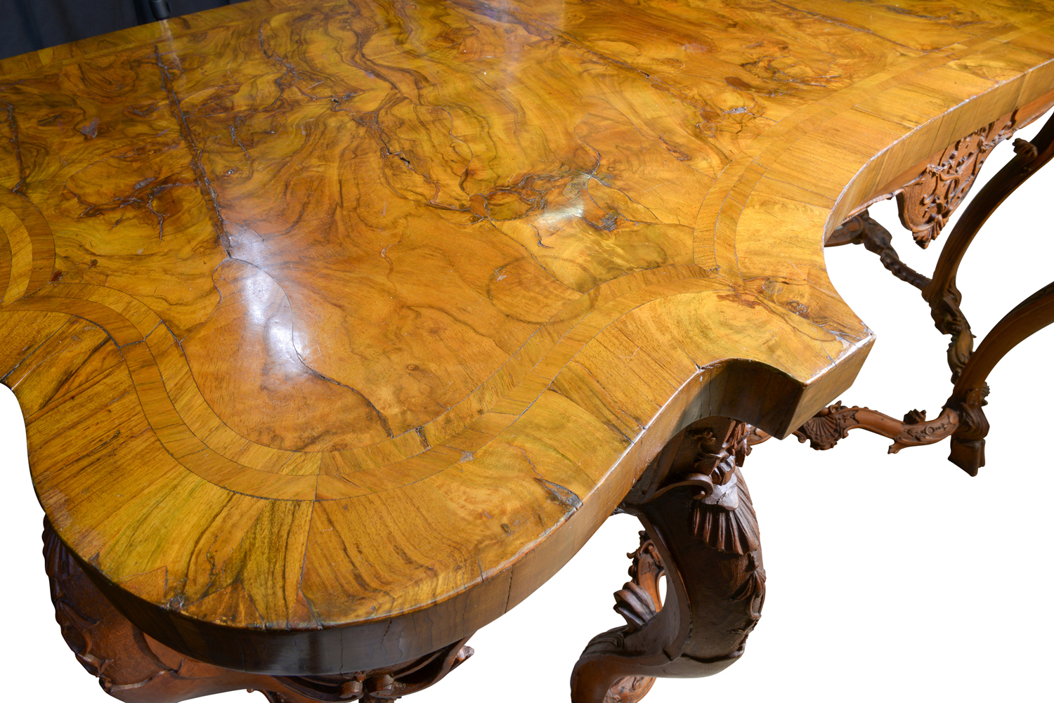 Stato di conservazione. Superficie: 60% (asporto della laccatura nella parte ad intaglio; fratture della impiallacciatura dovute alla tecnica di realizzazione del supporto; macchia circolare sul piano)