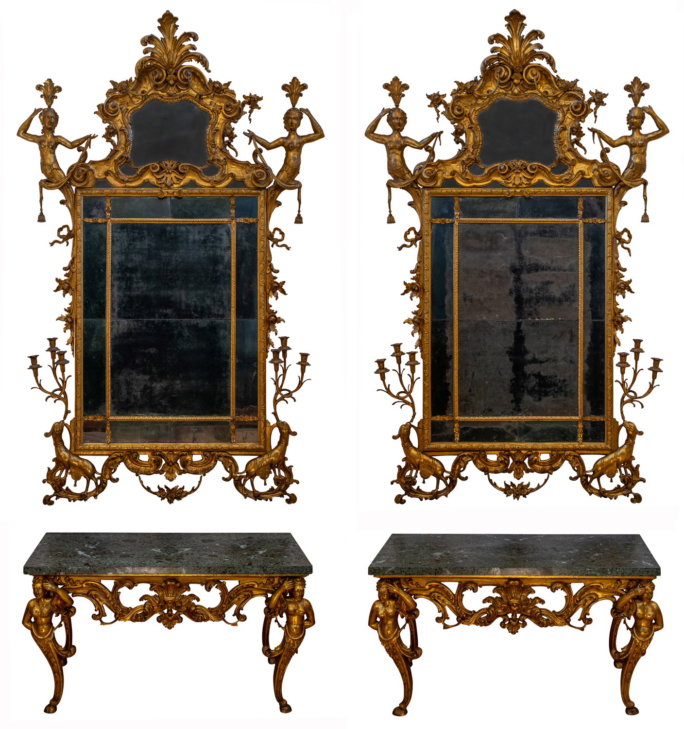 Coppia di tavoli da muro con specchiere a doppia cornice e cartiglio a tema di animali e sirene